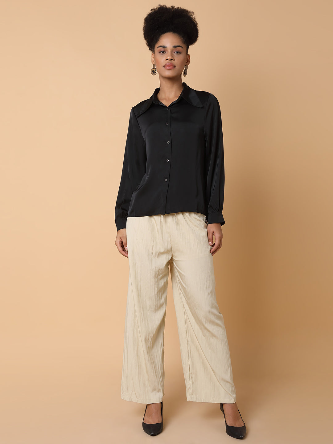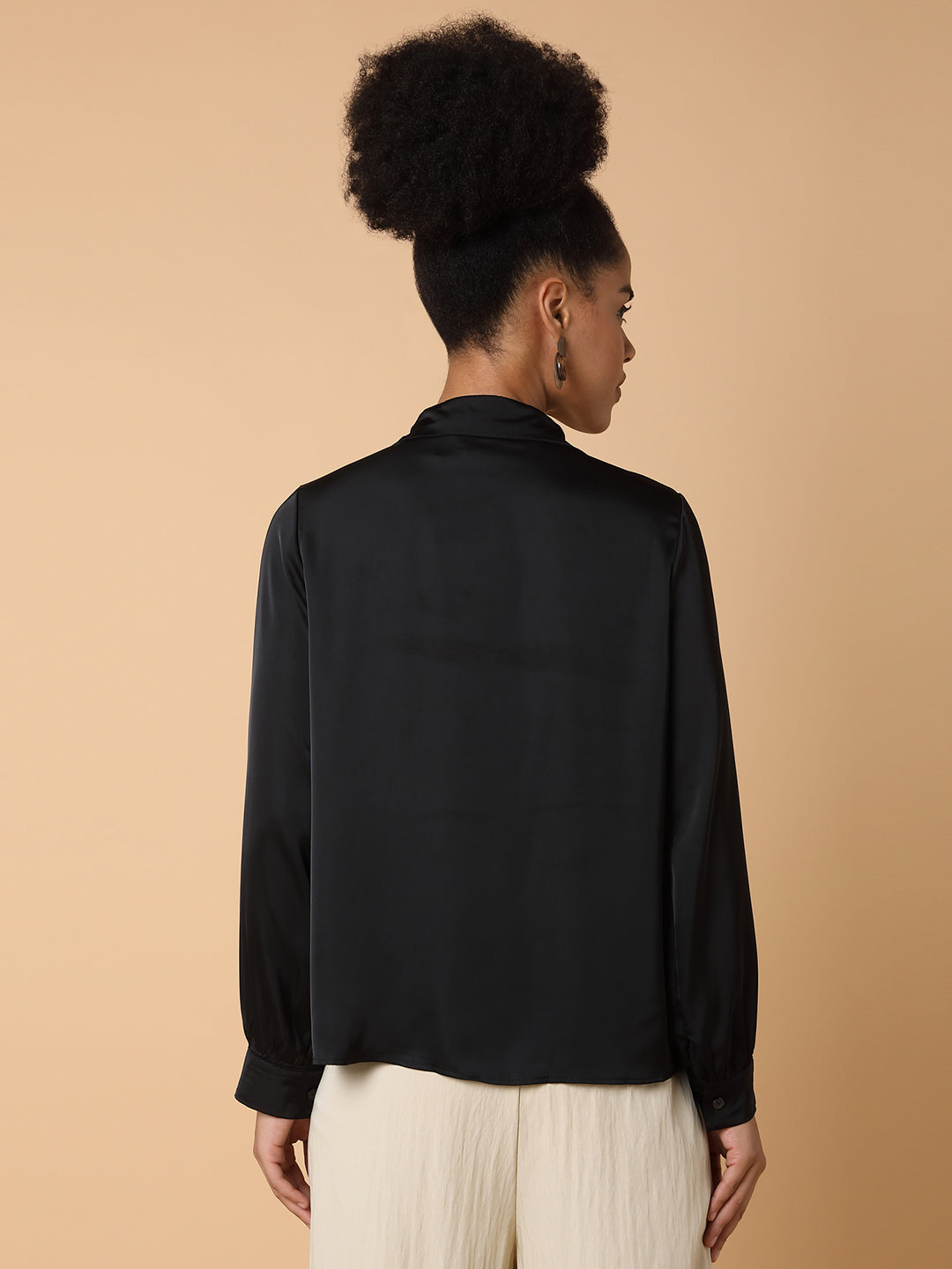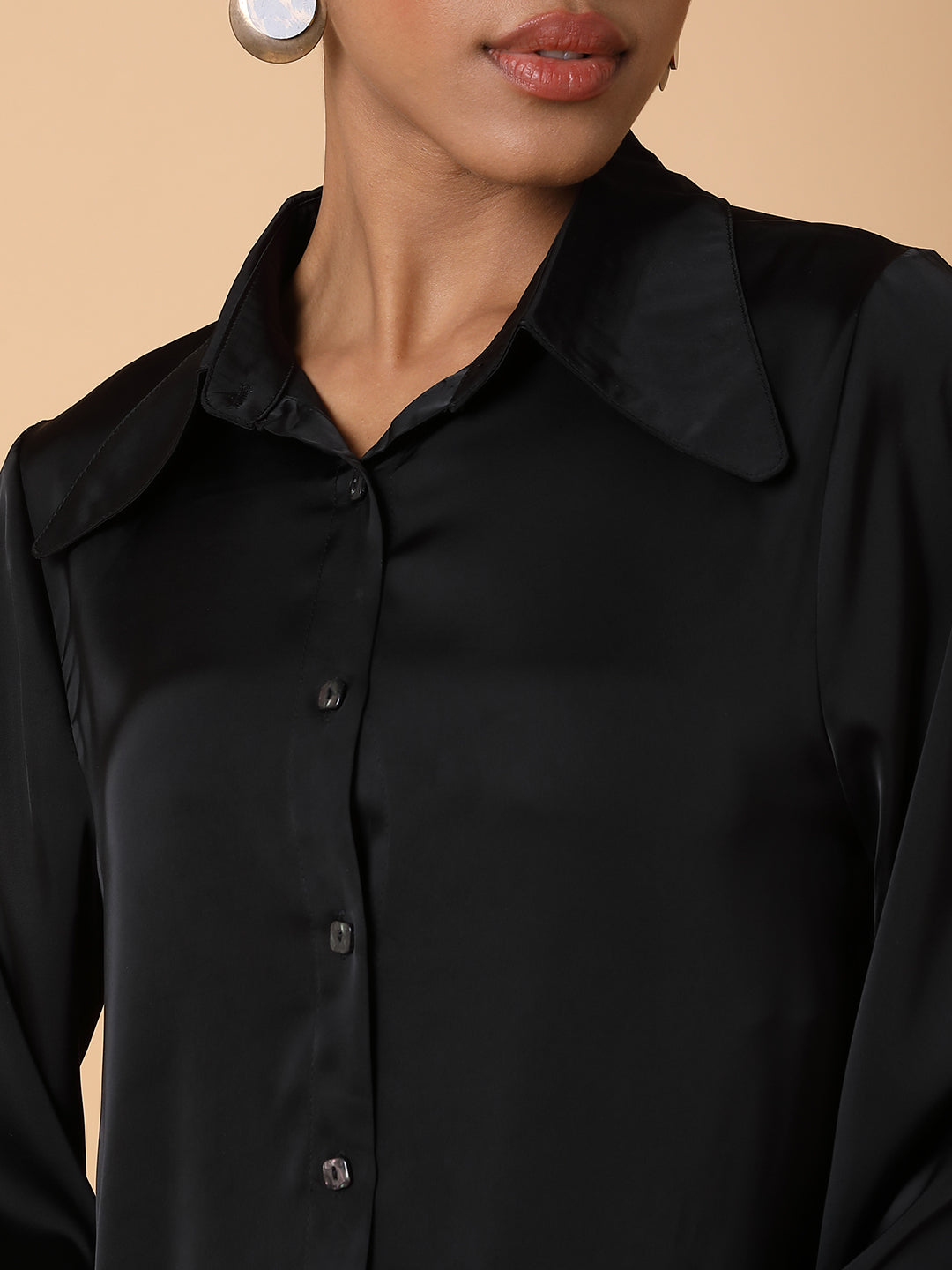 Women's Black Comfort Spread Collar Solid Satin Casual Shirt