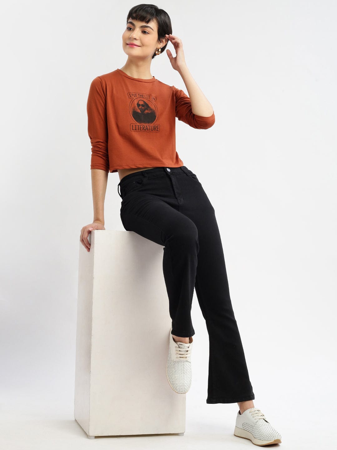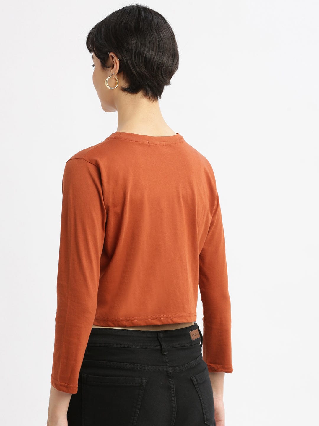 × Women's Brown Graphic Printed Round Neck Cotton Slim Fit Crop T-Shirt