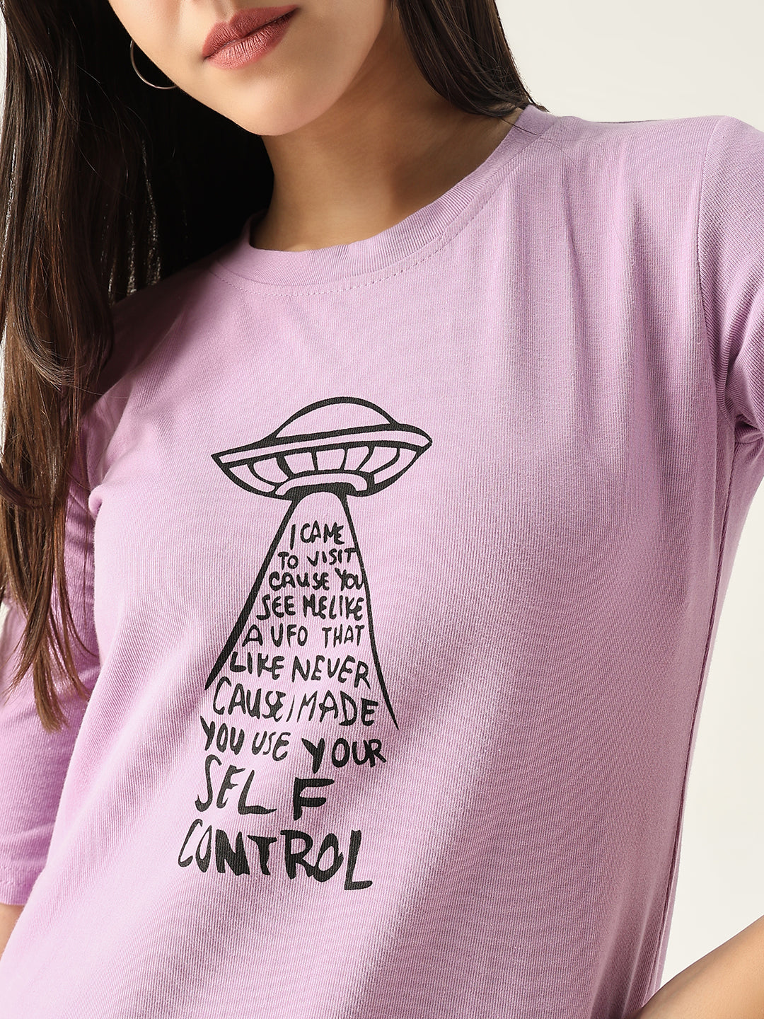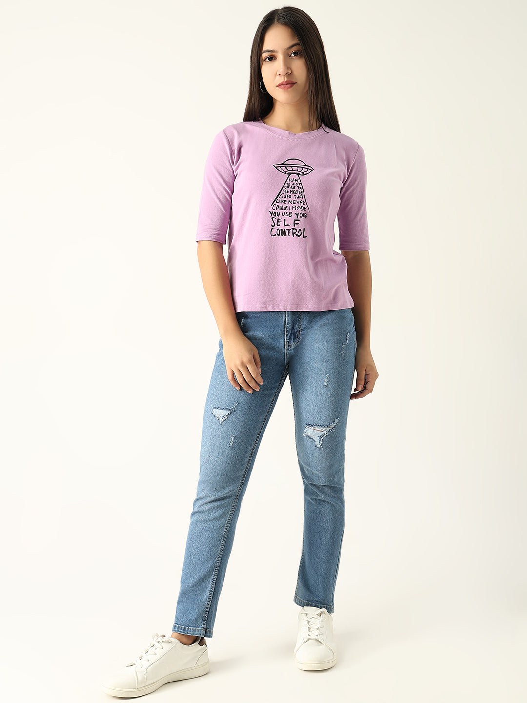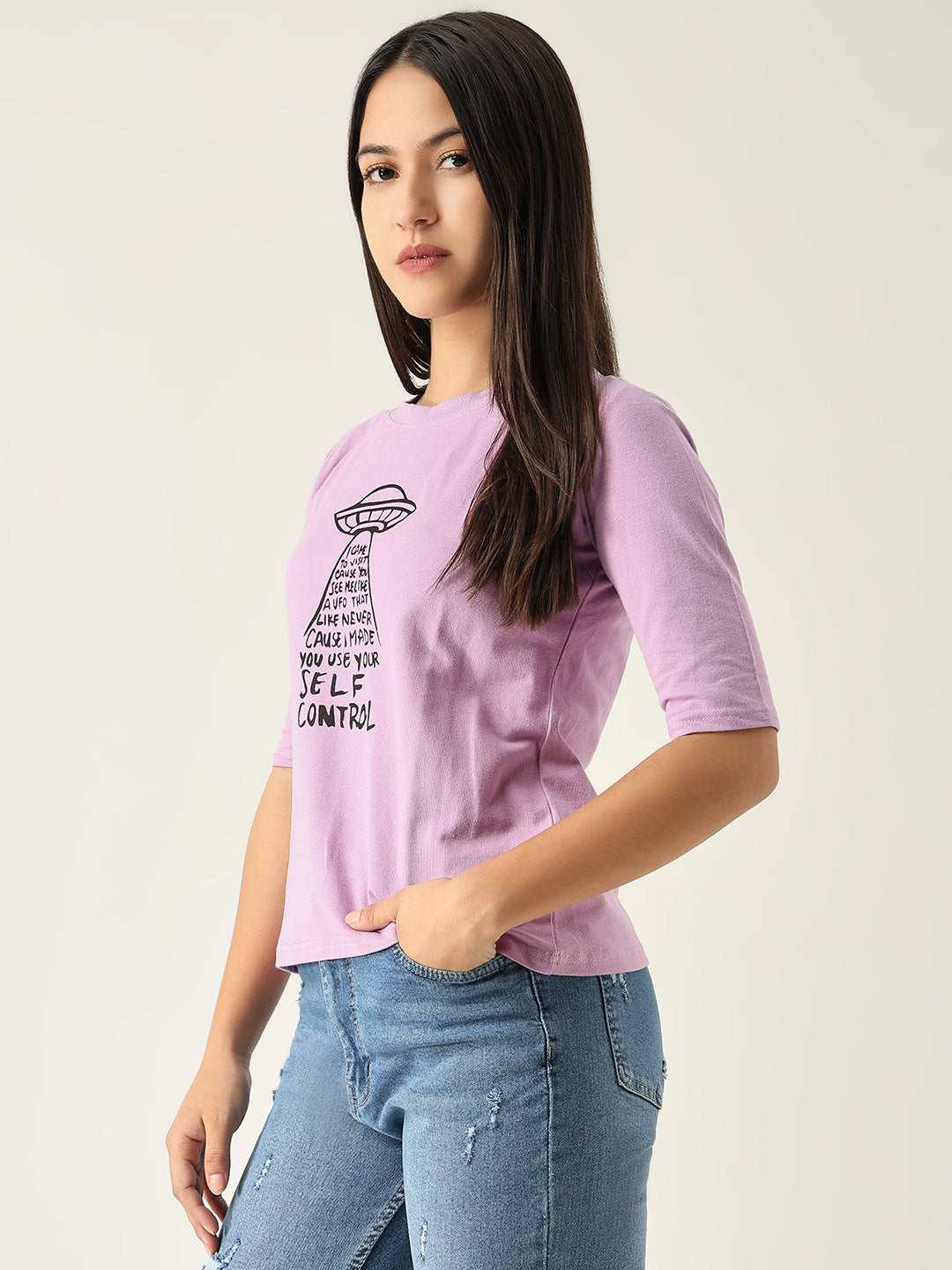 Women's Lavender Typography Printed Round Neck Cotton Slim Fit T-Shirt