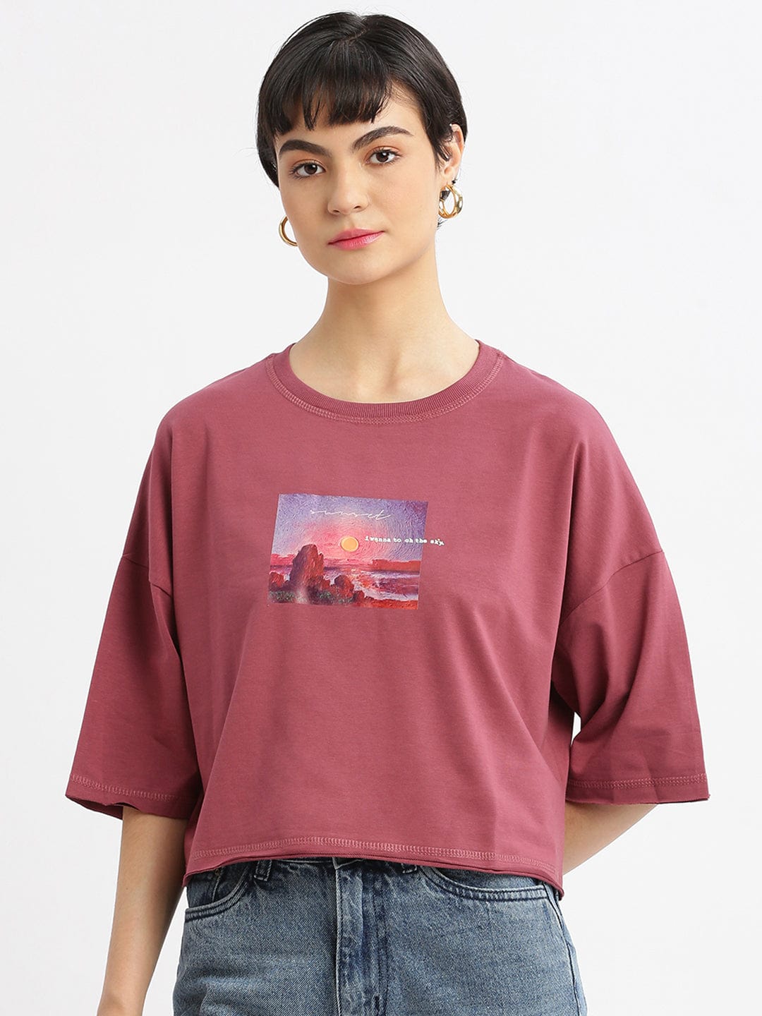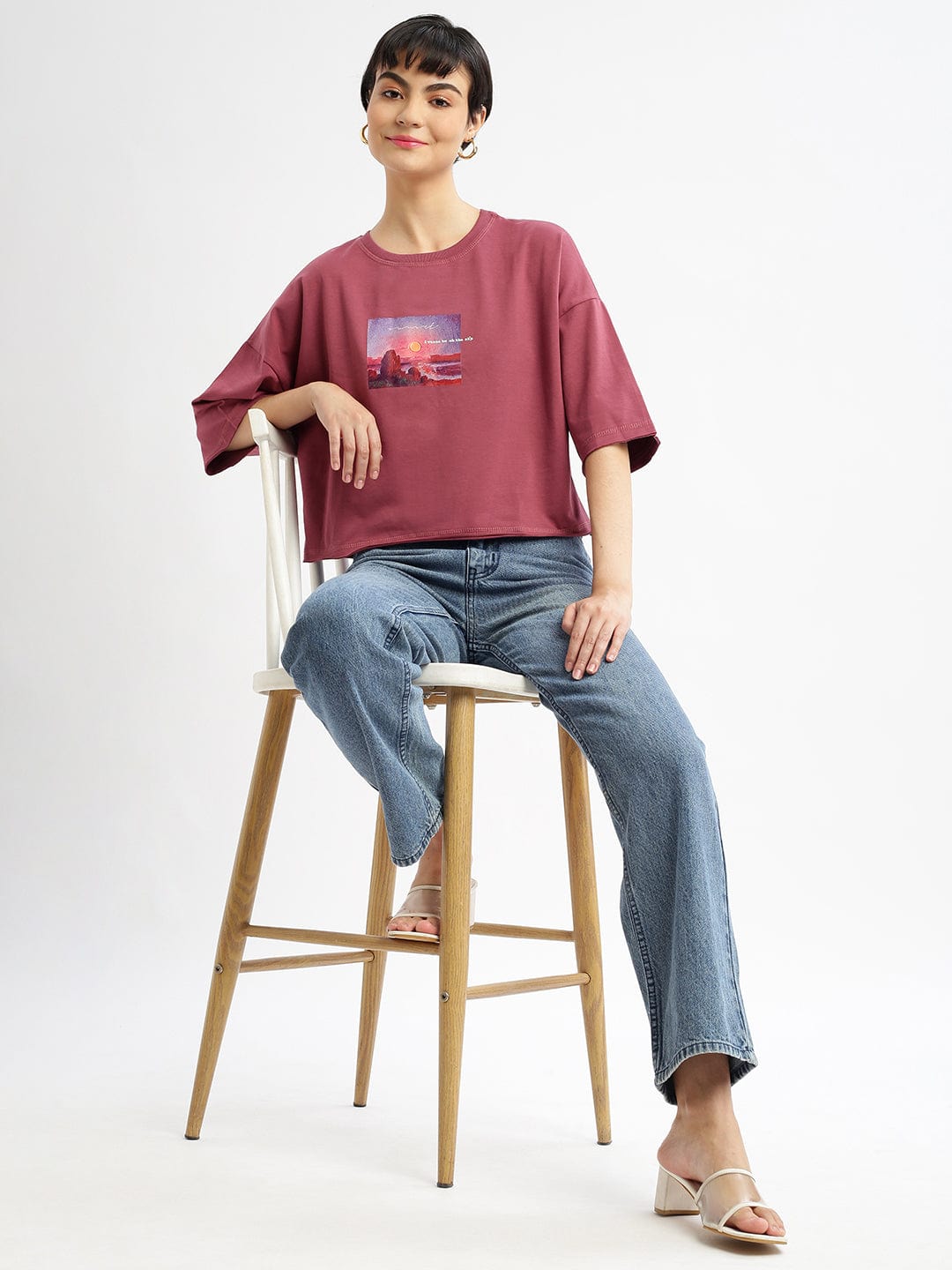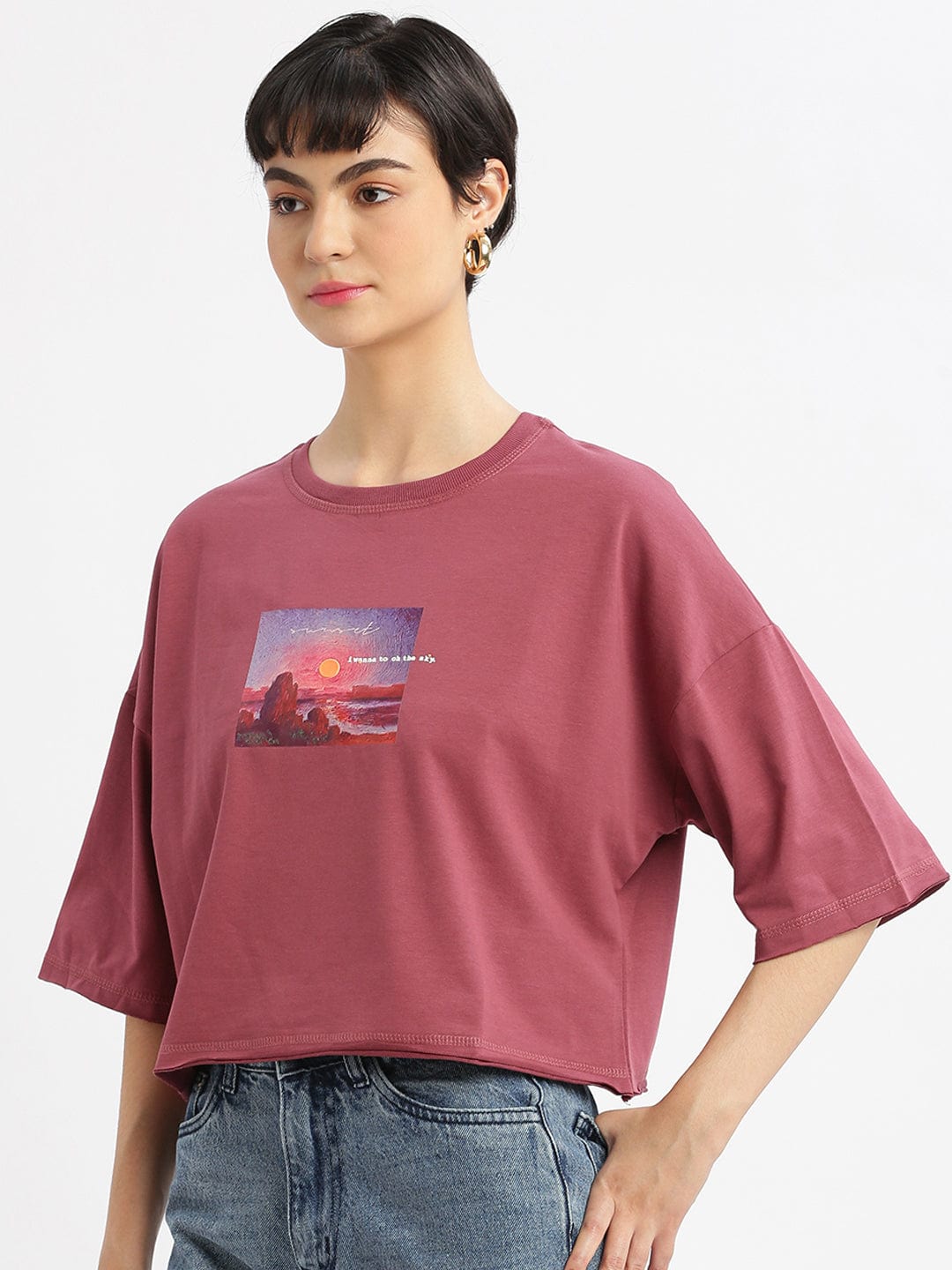 × Women's Mauve Printed Round Neck Cotton Boxy T-Shirt