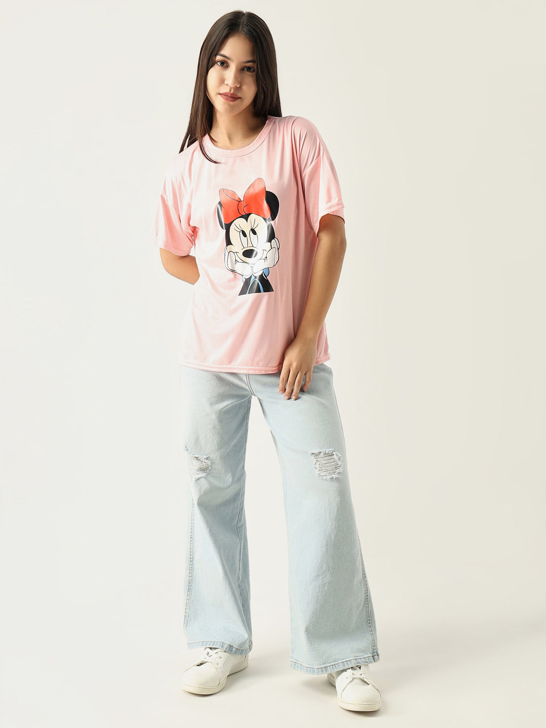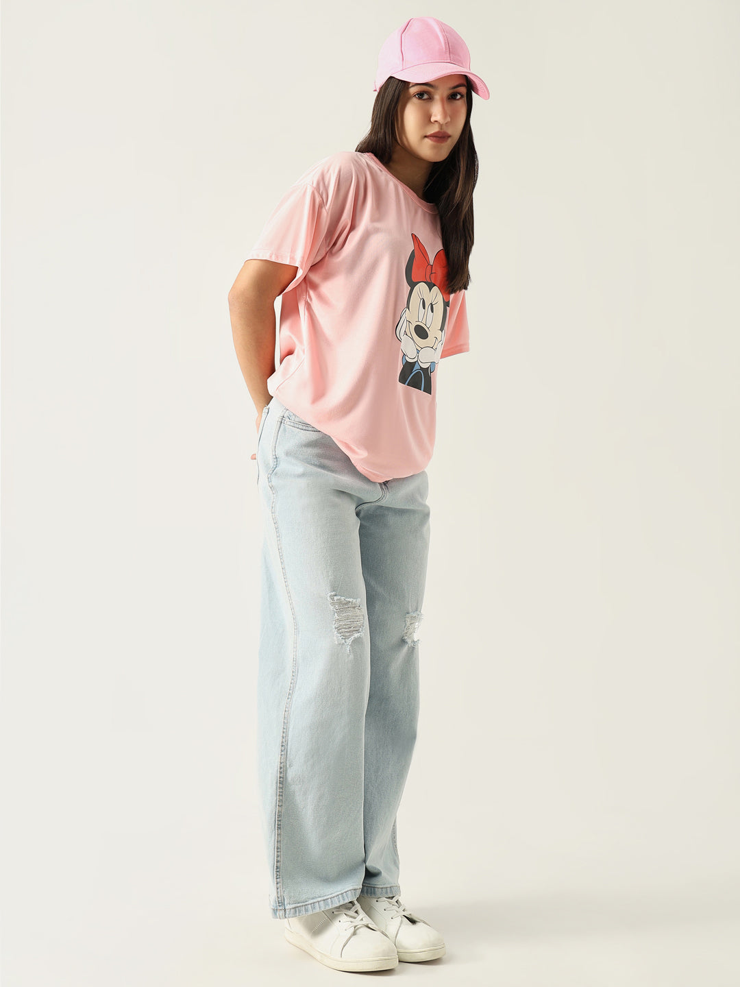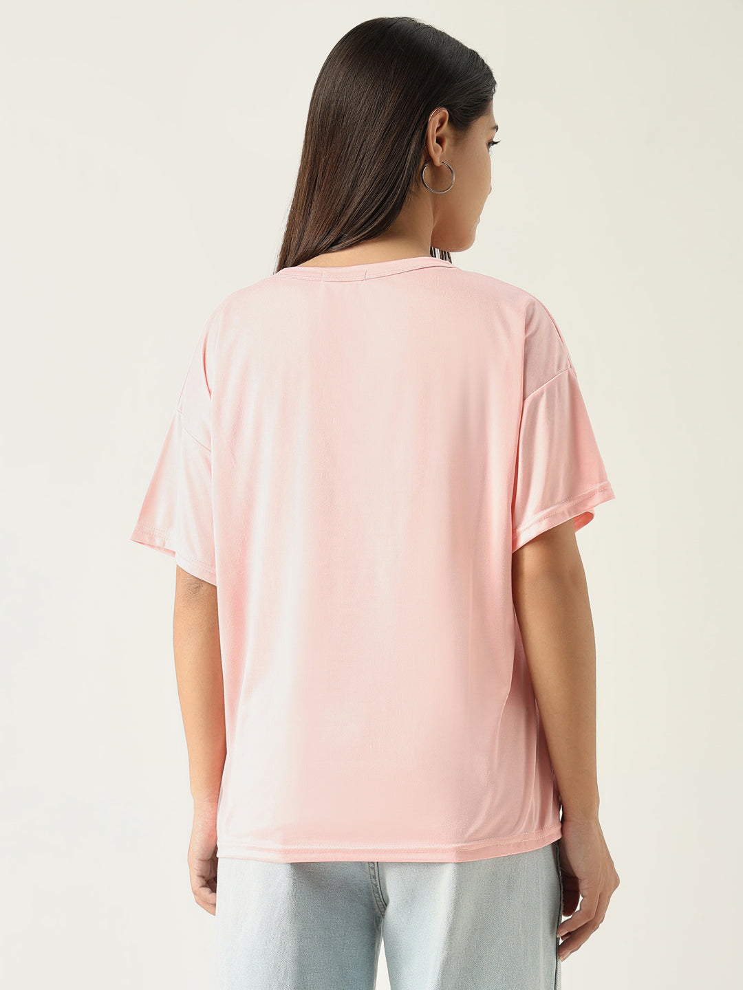 Women's Pink Graphic Printed Round Neck Cotton Relaxed Fit T-Shirt