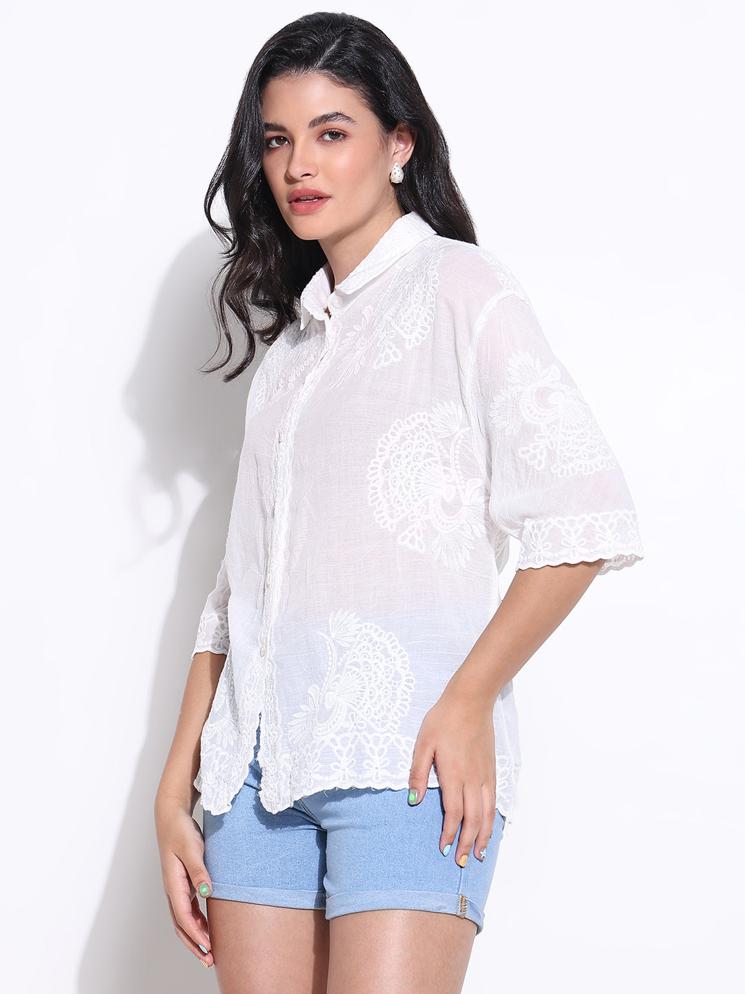 Introducing our Women's White Comfort Fit Spread Collar Embroidered Cotton Oversized Casual Shirt, designed for the modern woman who values both style and comfort. This exquisite shirt features a semi-sheer fabric, ideal for summer wear, combining a relaxed oversized silhouette with elegant embroidery detailing. Perfect for casual outings, this piece embodies the essence of Western Wear while ensuring you stay effortlessly chic.