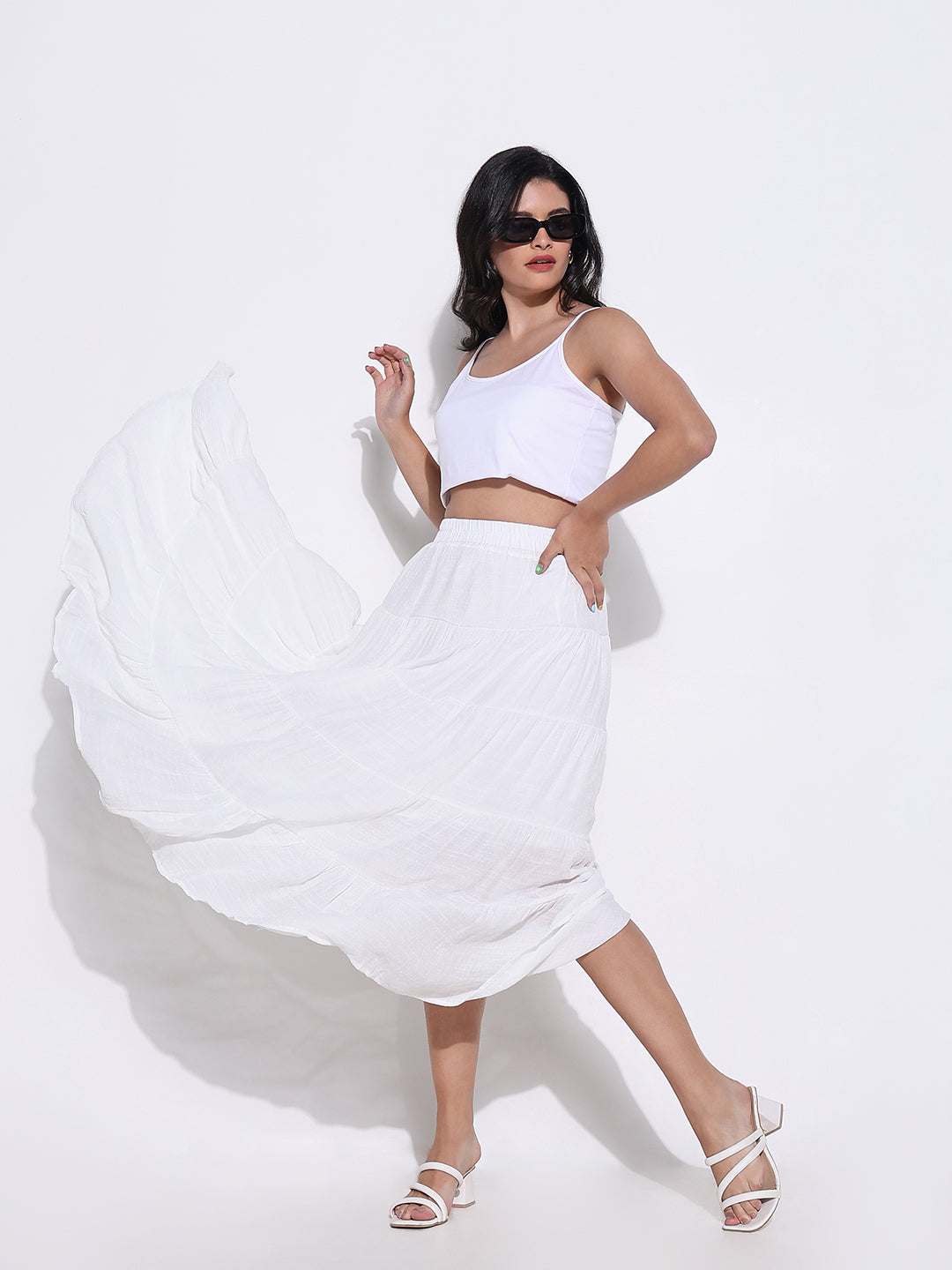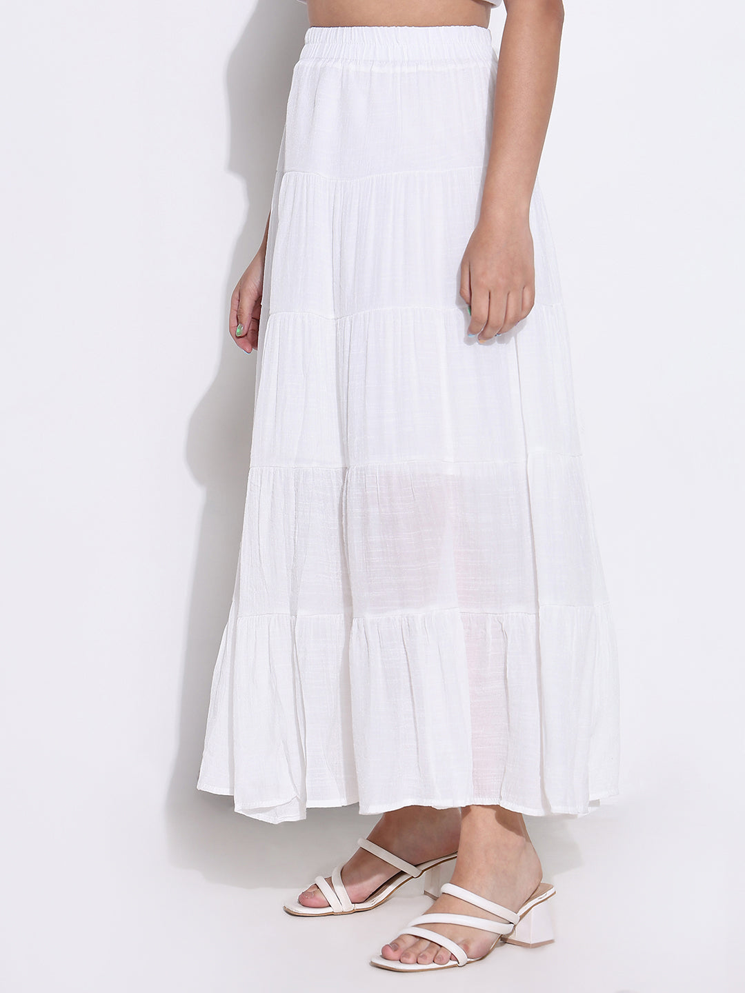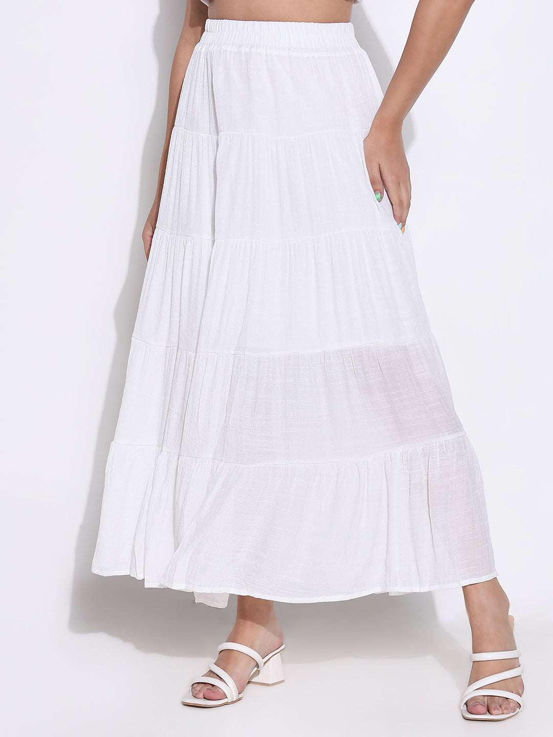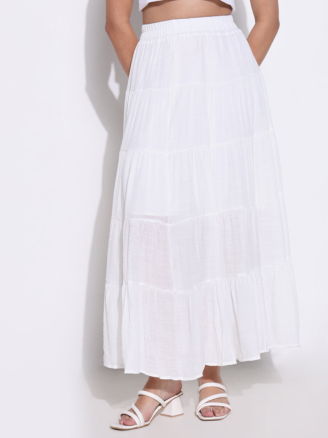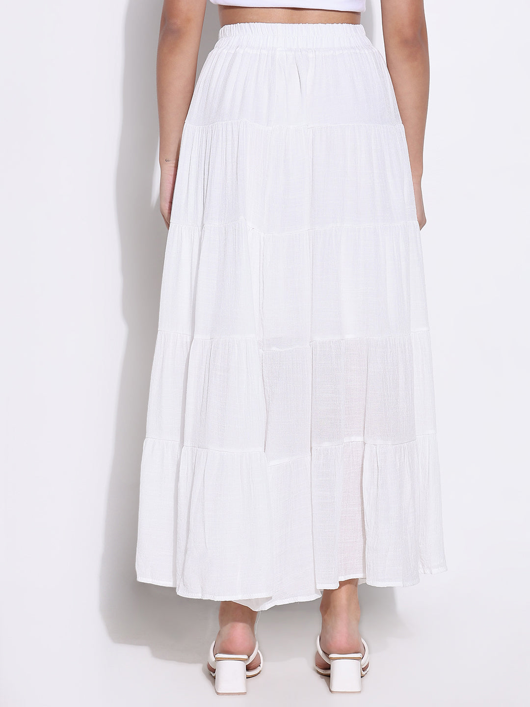 Choose the Women's White Tiered Maxi Skirt for its unique ability to blend style and comfort seamlessly. This bestseller stands out in the women bottomwear category with its solid design and flared silhouette, ensuring you remain stylish and comfortable for any occasion. With up to 65% off, it’s the perfect addition to your spring collection for 2025!
