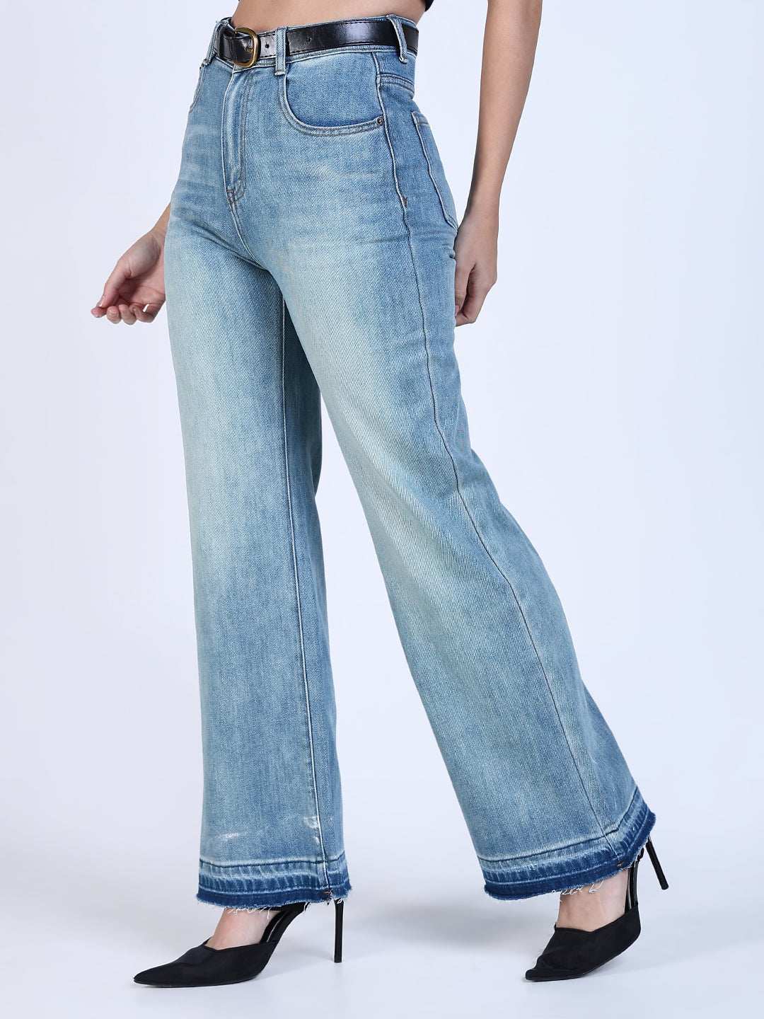 Women's Shaded Blue Mini Flare Fit Jeans with Hem Detail