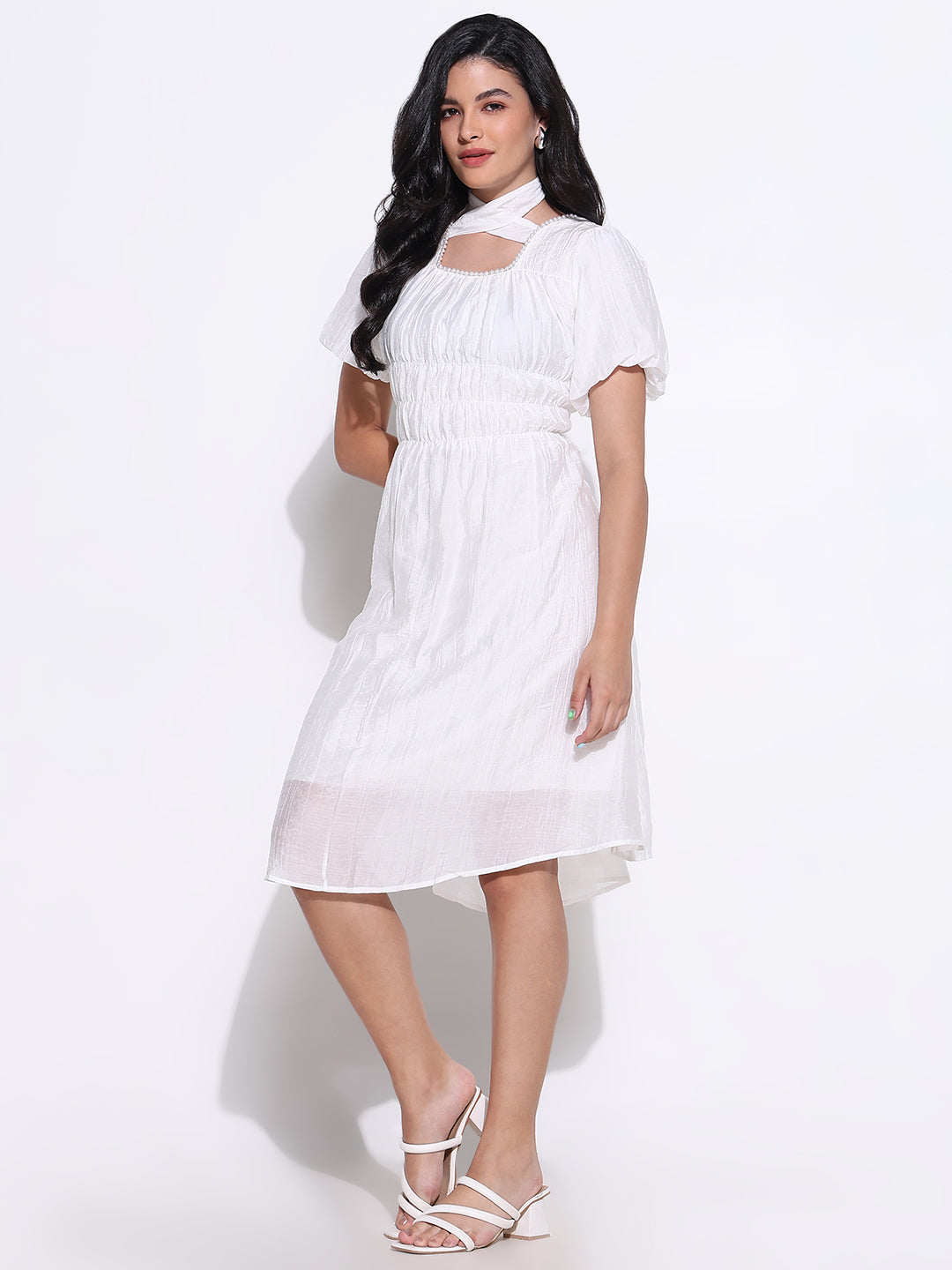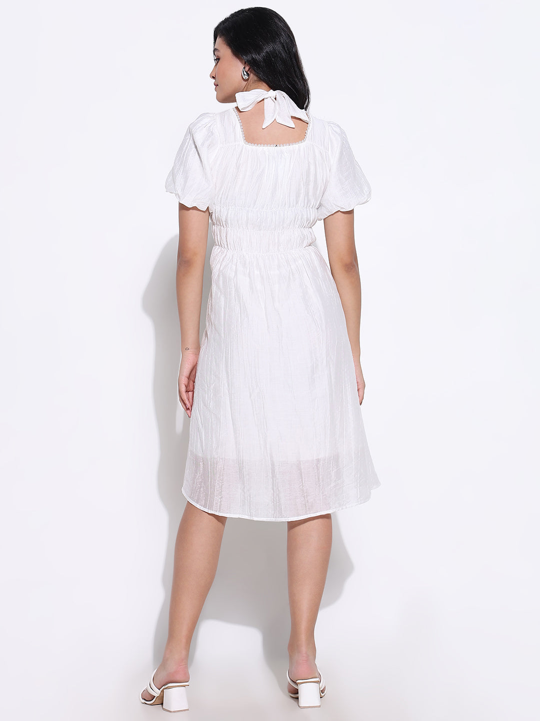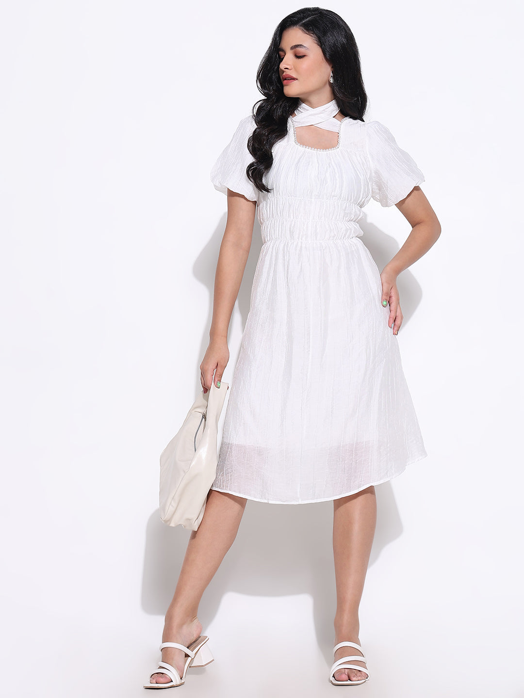 Women's Off White Puff Sleeve Georgette Fit & Flare Dress