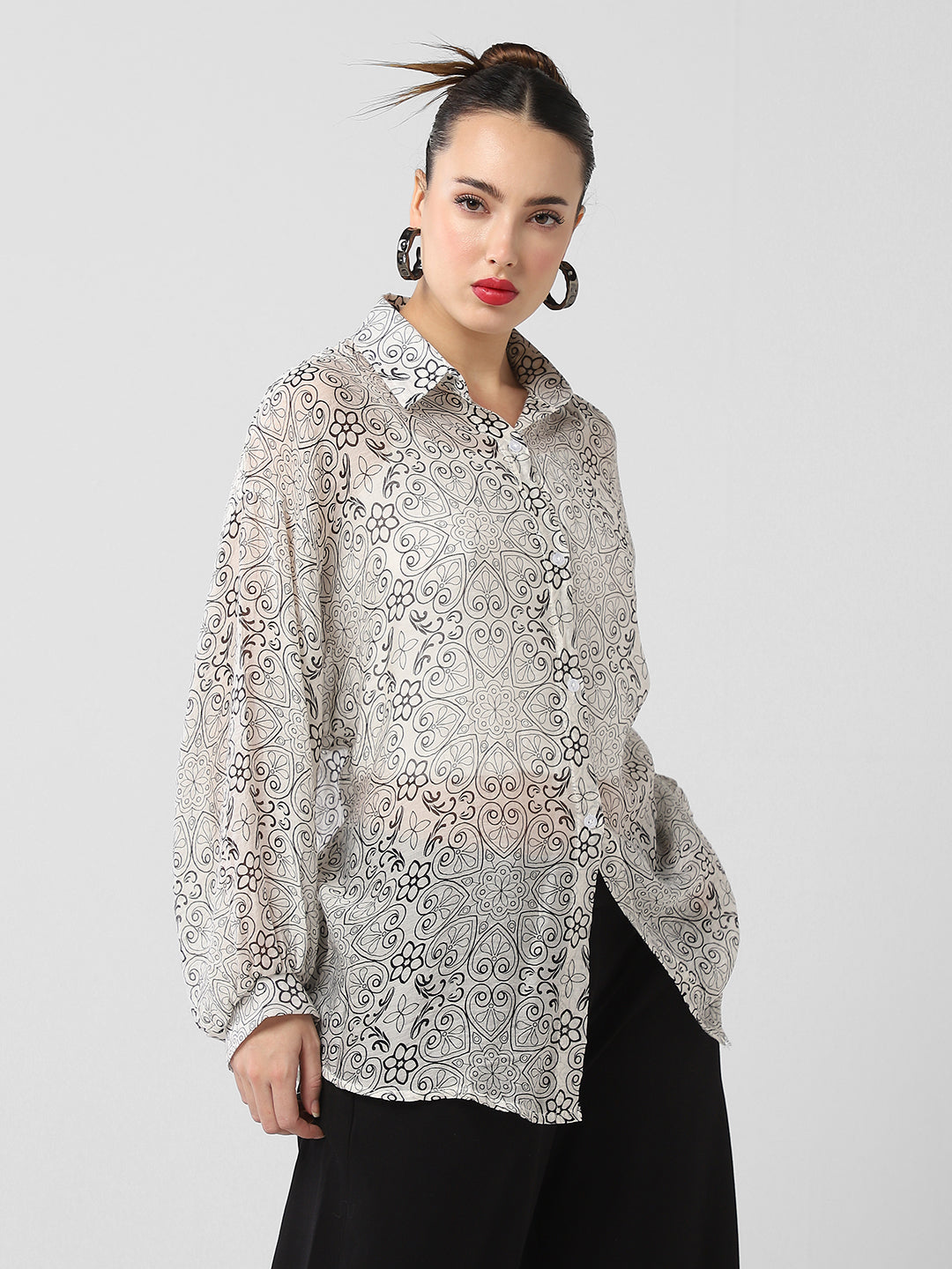 Introducing the Women's Grey Comfort Semi Sheer Printed Casual Shirt, a perfect blend of style and comfort. This oversized casual shirt is designed for modern women who seek both elegance and ease in their everyday outfits. Crafted from high-quality cotton, it features a chic semi-sheer finish that adds a touch of sophistication to your wardrobe. Ideal for office wear or casual outings, this shirt is a versatile addition to your collection.