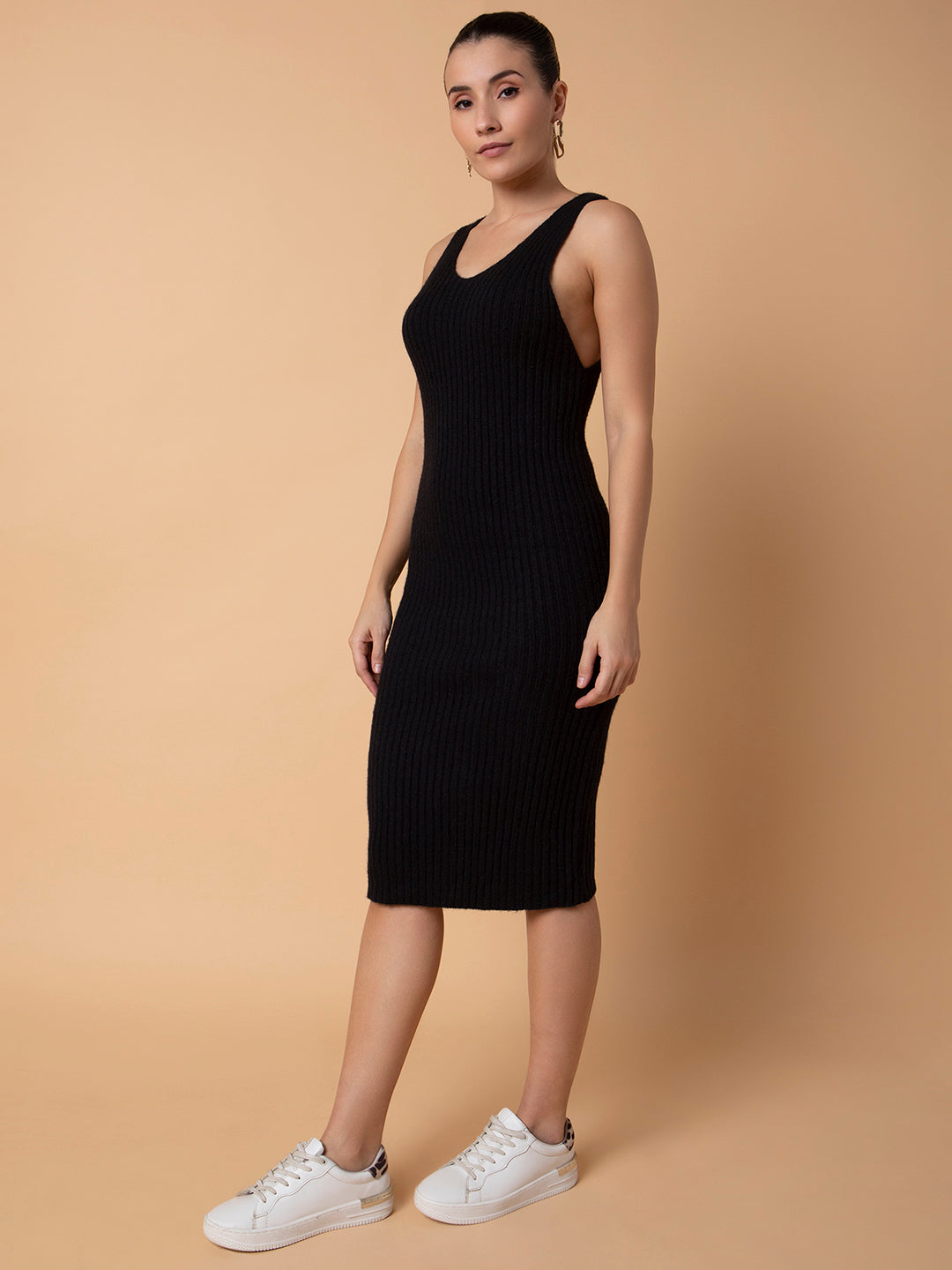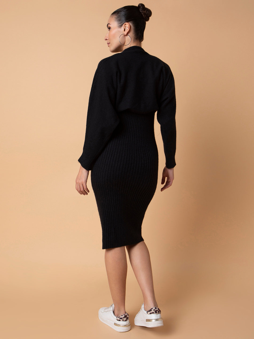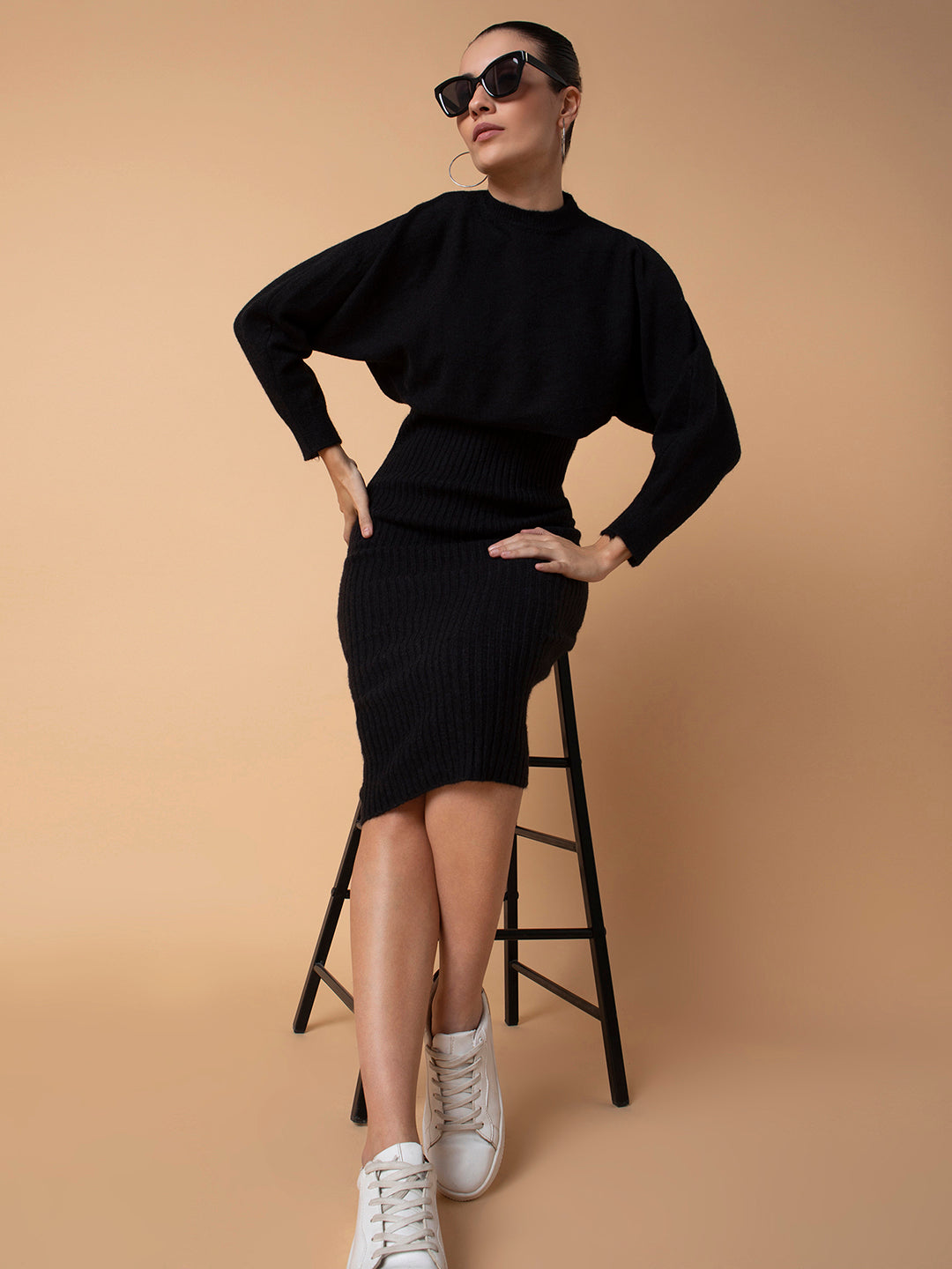 Elevate your wardrobe with the Women Solid Black Bodycon Dress with Top, a timeless piece that seamlessly blends elegance and comfort. This versatile dress is perfect for any occasion, from casual outings to formal events.
