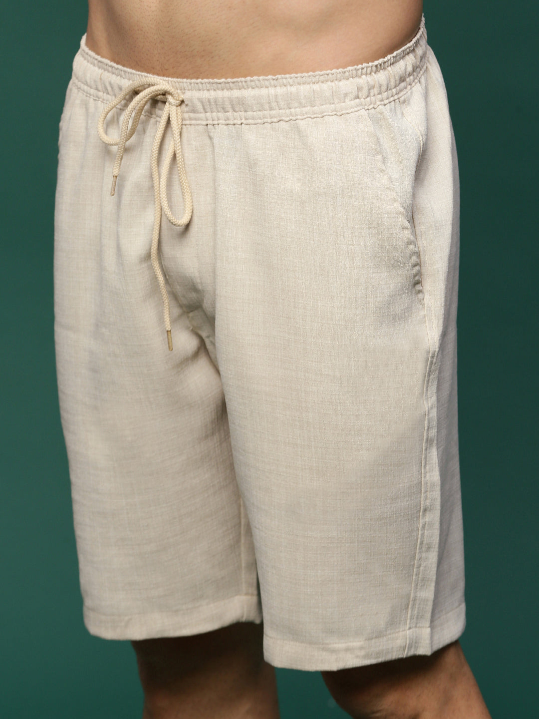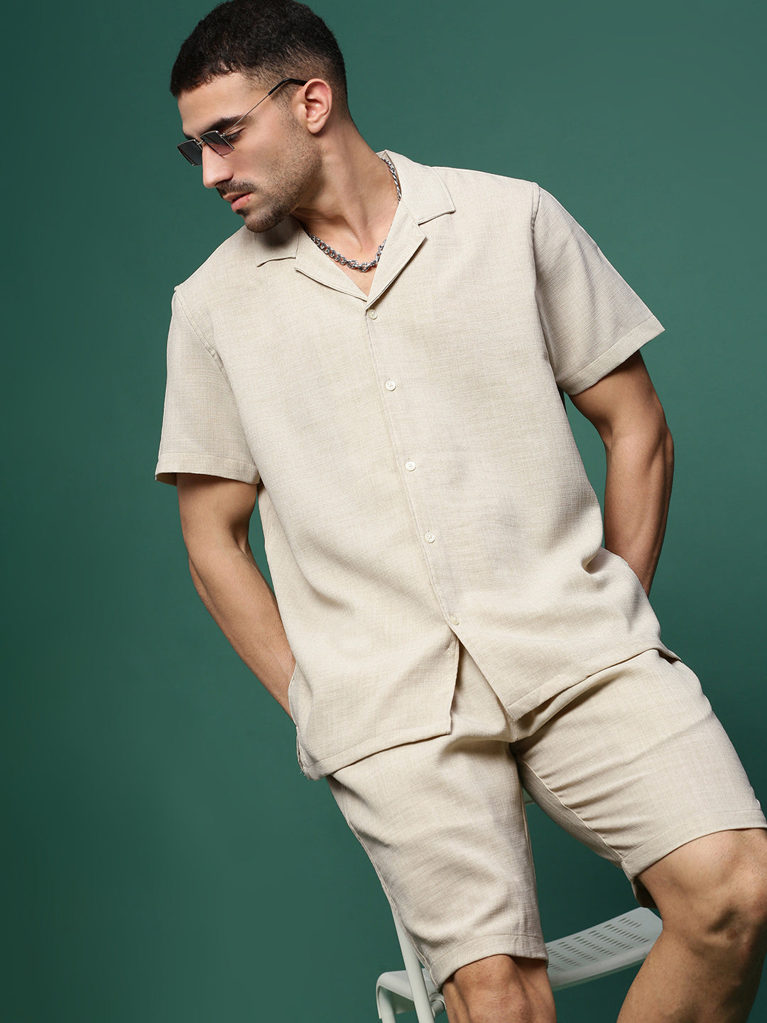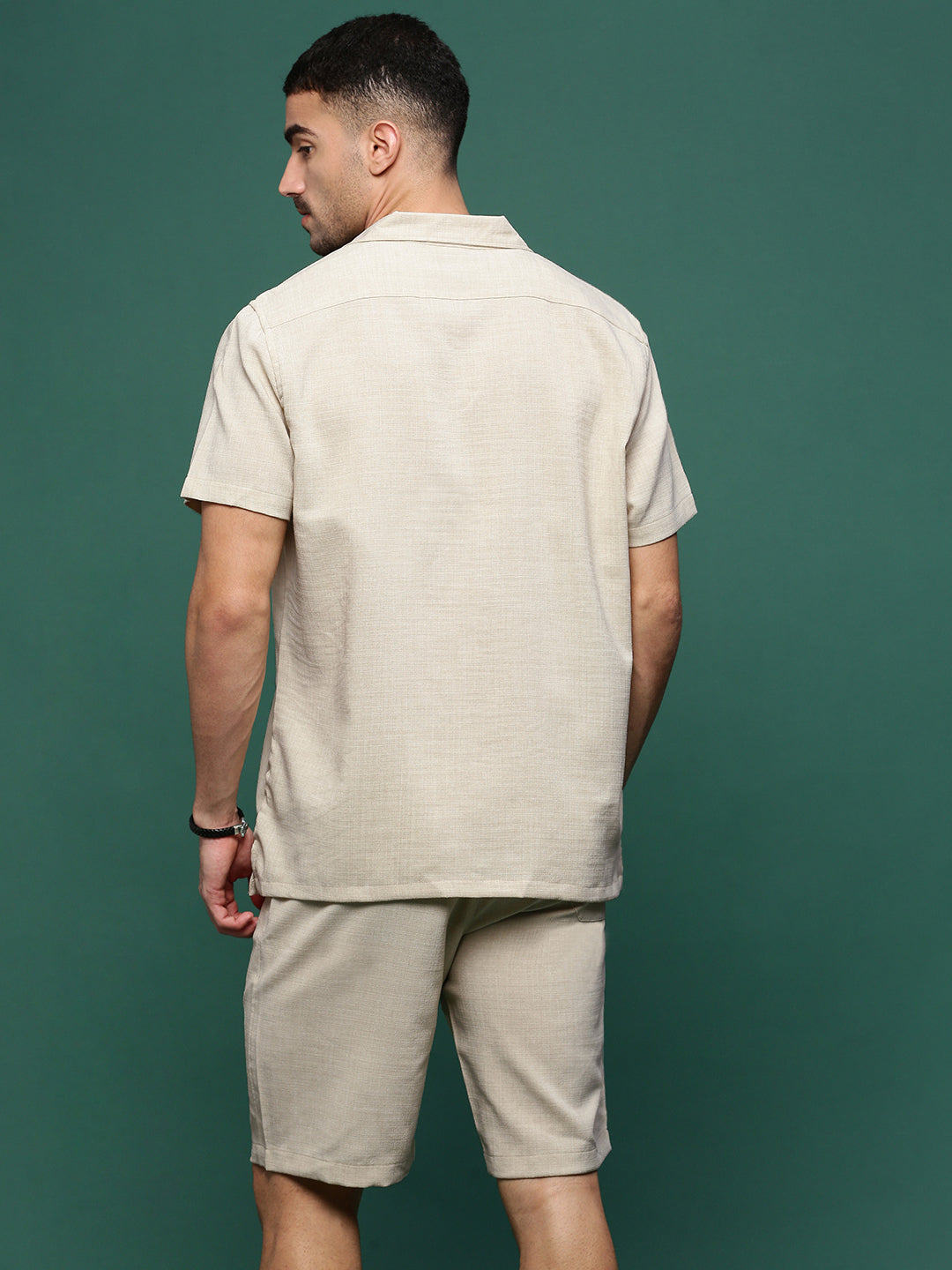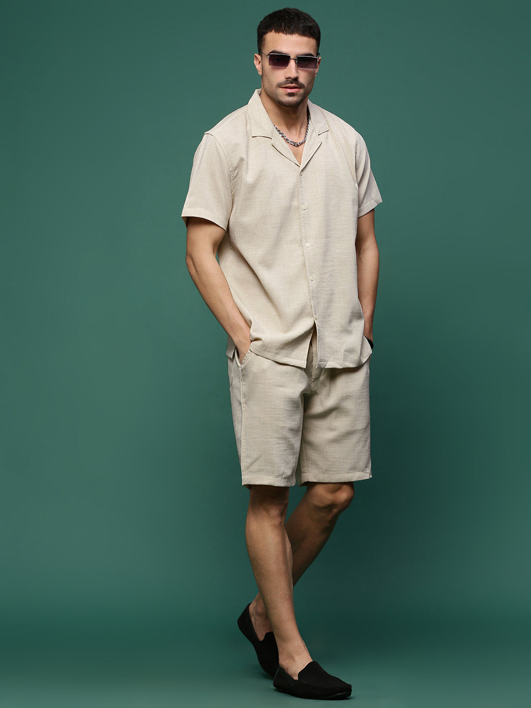 Men's Beige Cuban Collar Solid Co-Ords Set