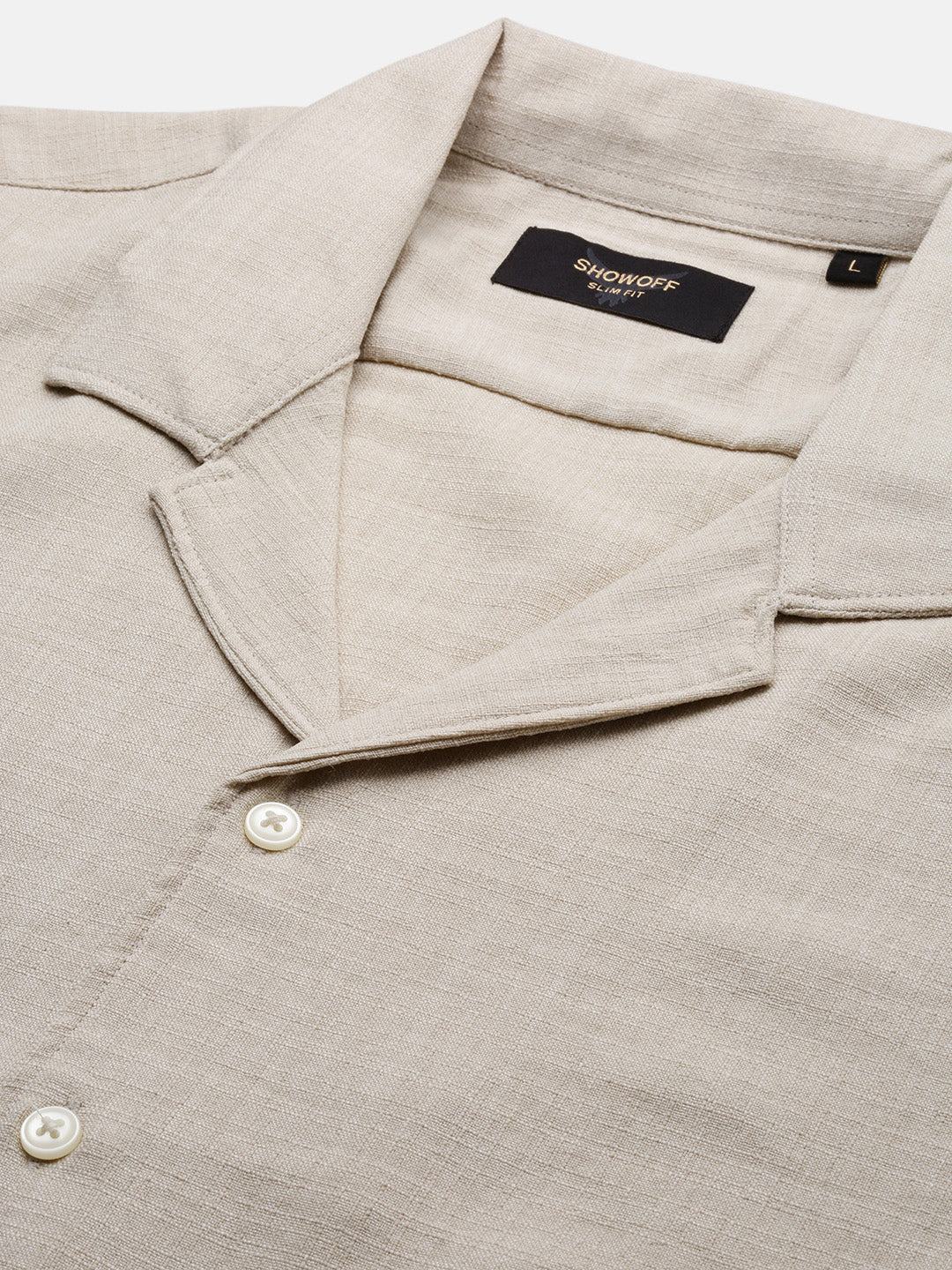 • Beige shade with a classic Cuban collar delivers a refined, versatile look.