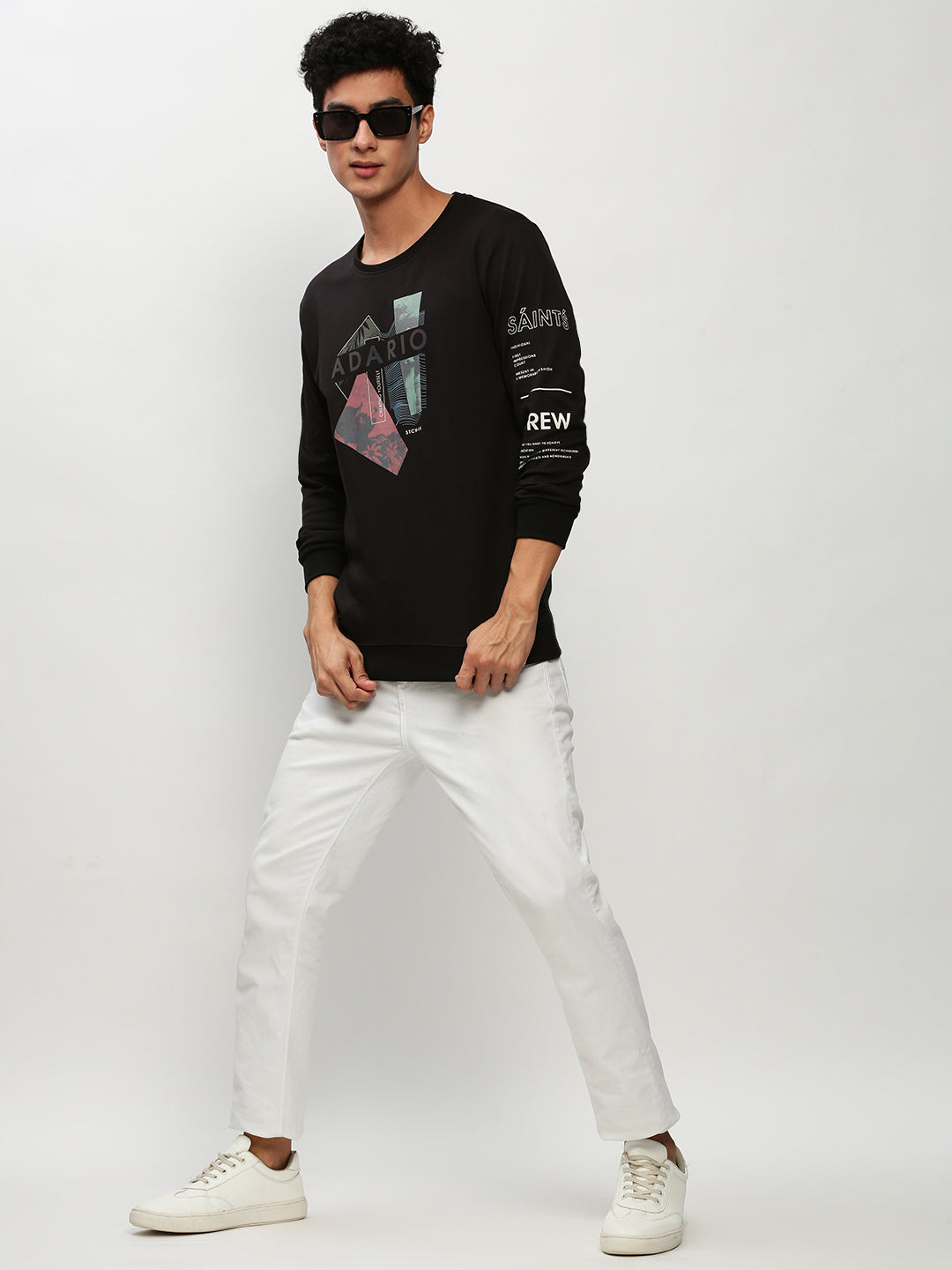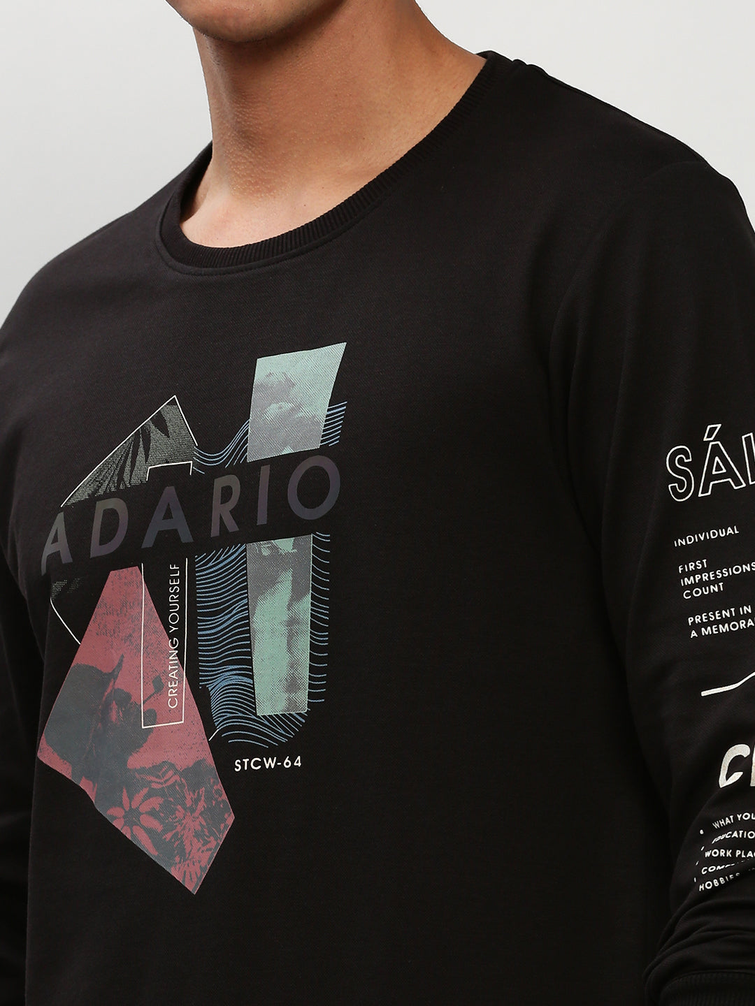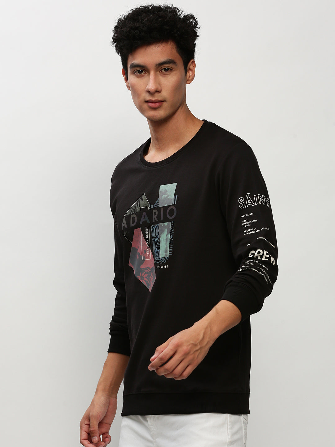 Men's Black Graphic Printed Long Sleeves Cotton Terry Pullover Sweatshirt