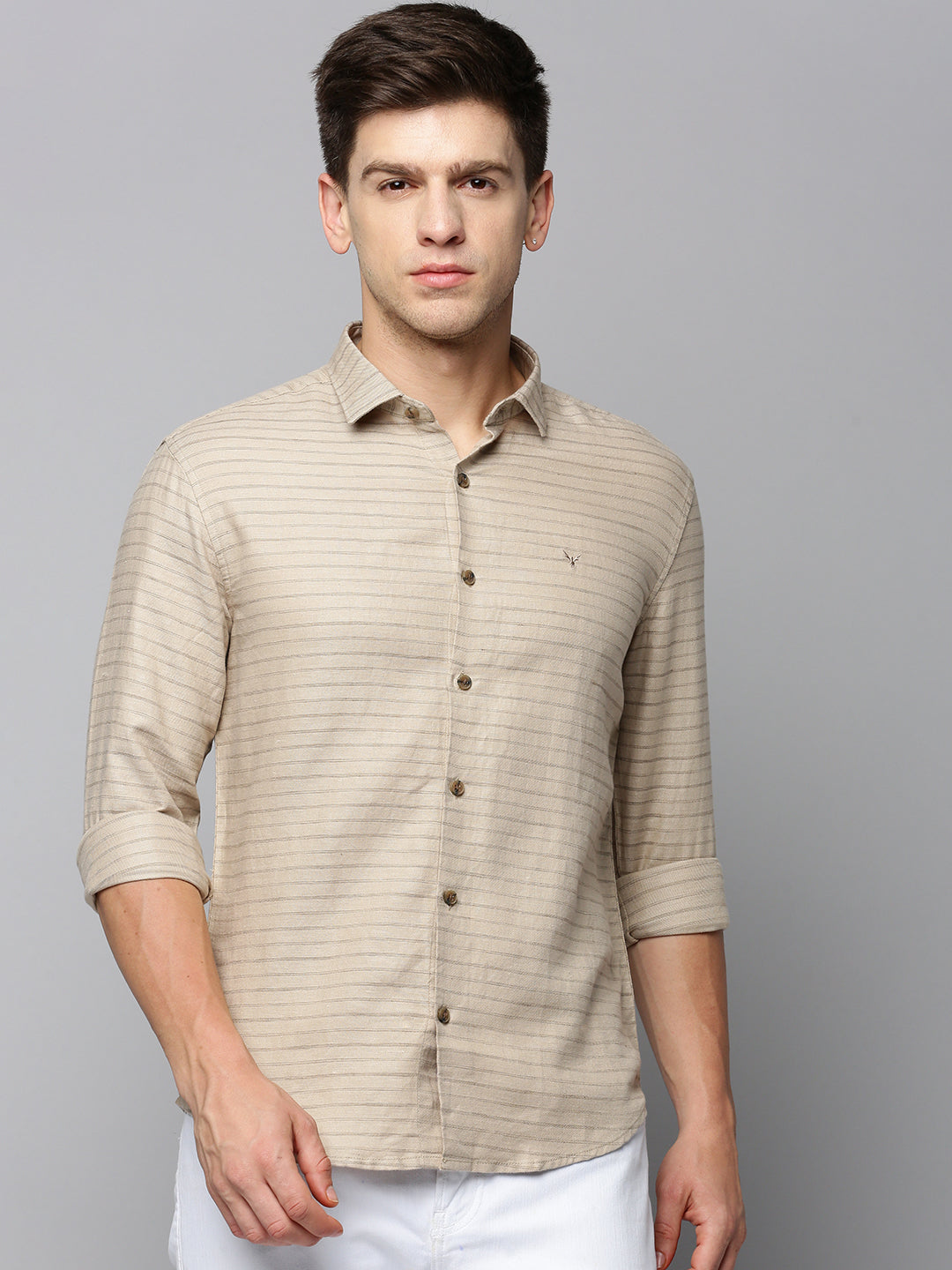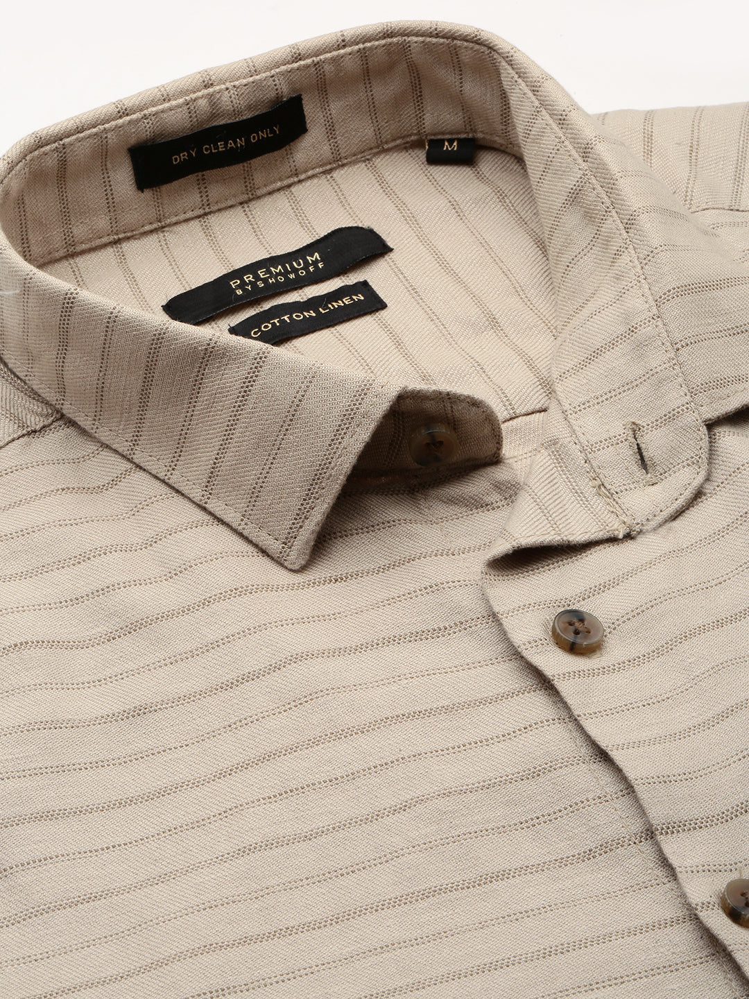 Introducing our stylish Men's Tan Striped Casual Shirt, designed for the modern man who values comfort and fashion. Made from breathable linen, this shirt is perfect for both spring and autumn, ensuring you stay comfortable and chic, no matter the season. The striking horizontal stripes add a touch of flair, making it a must-have in your casual wear collection.