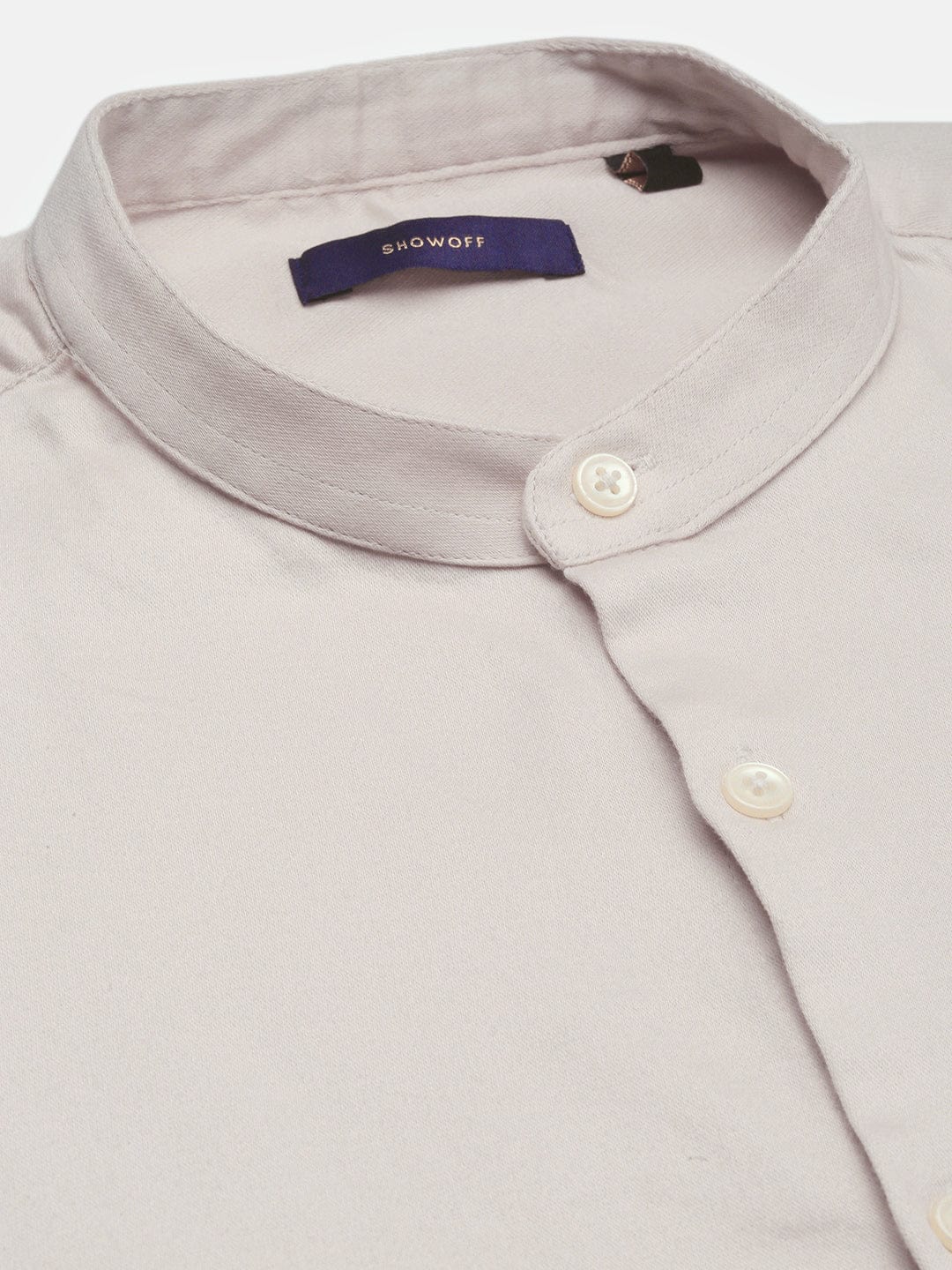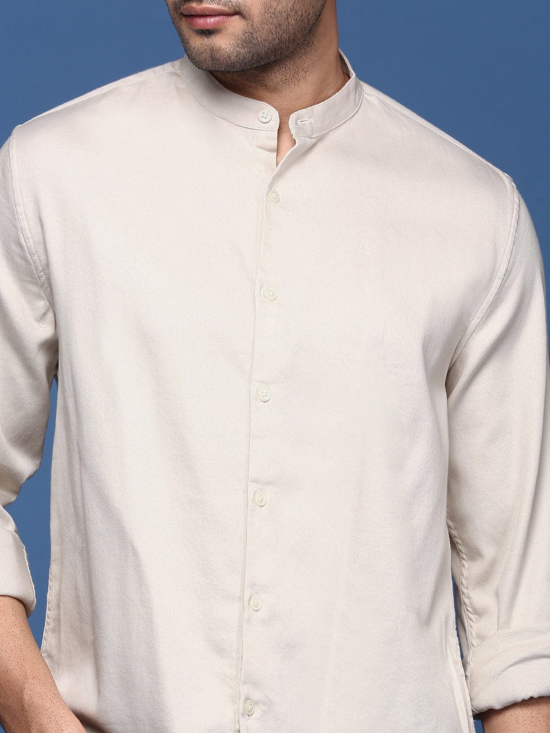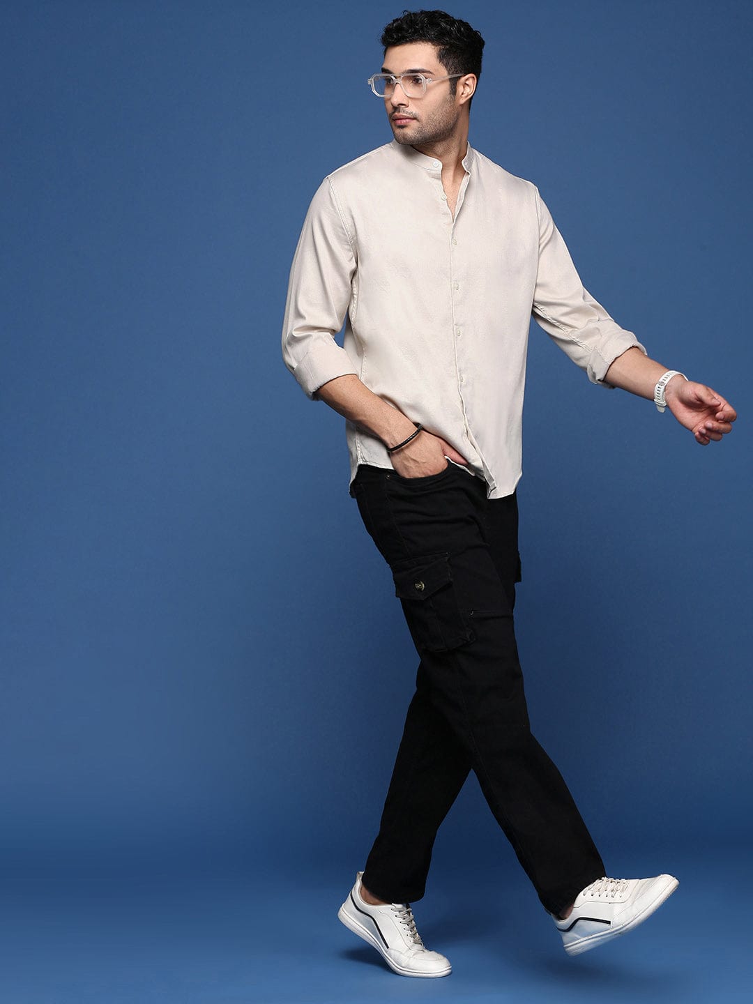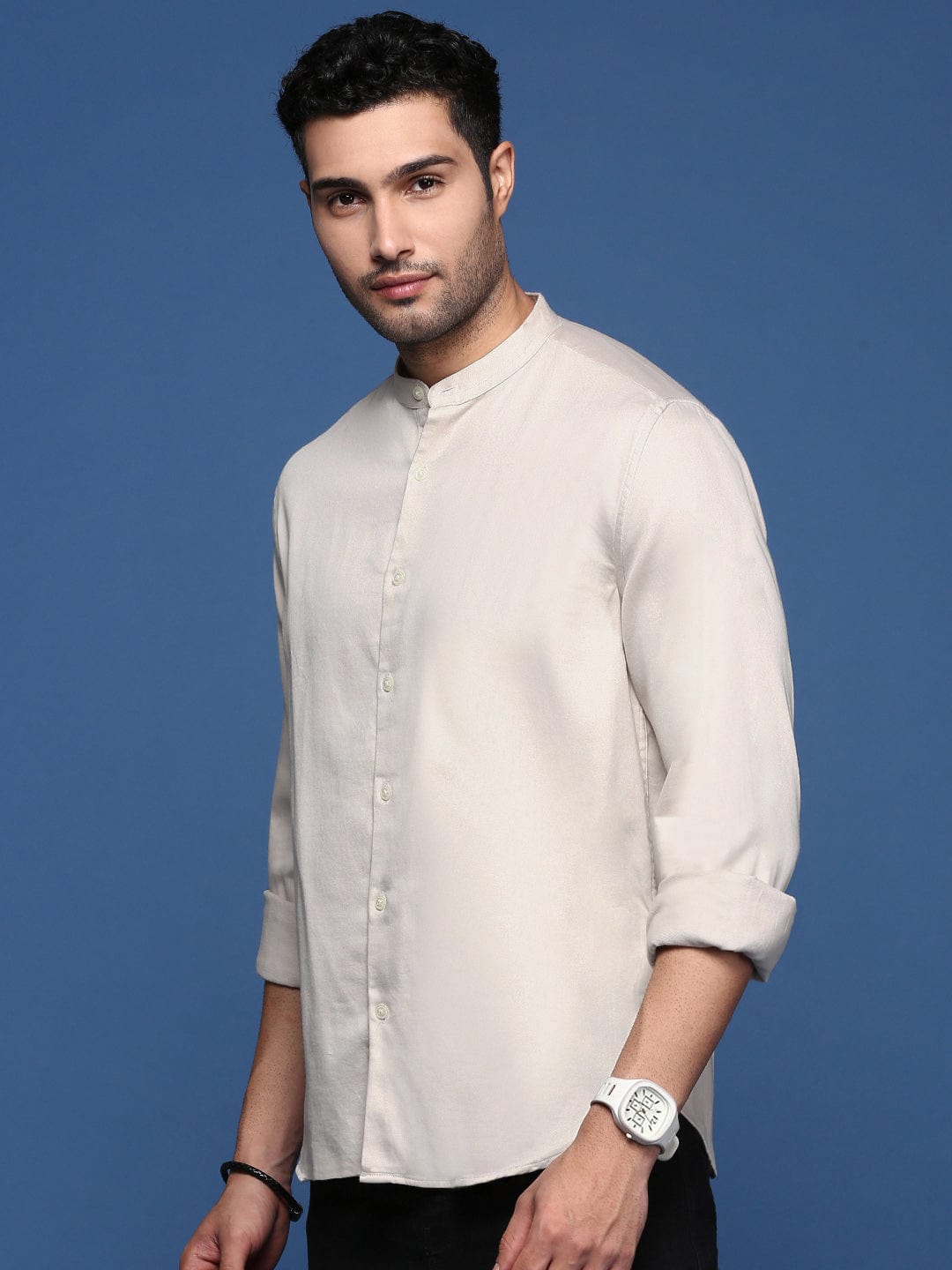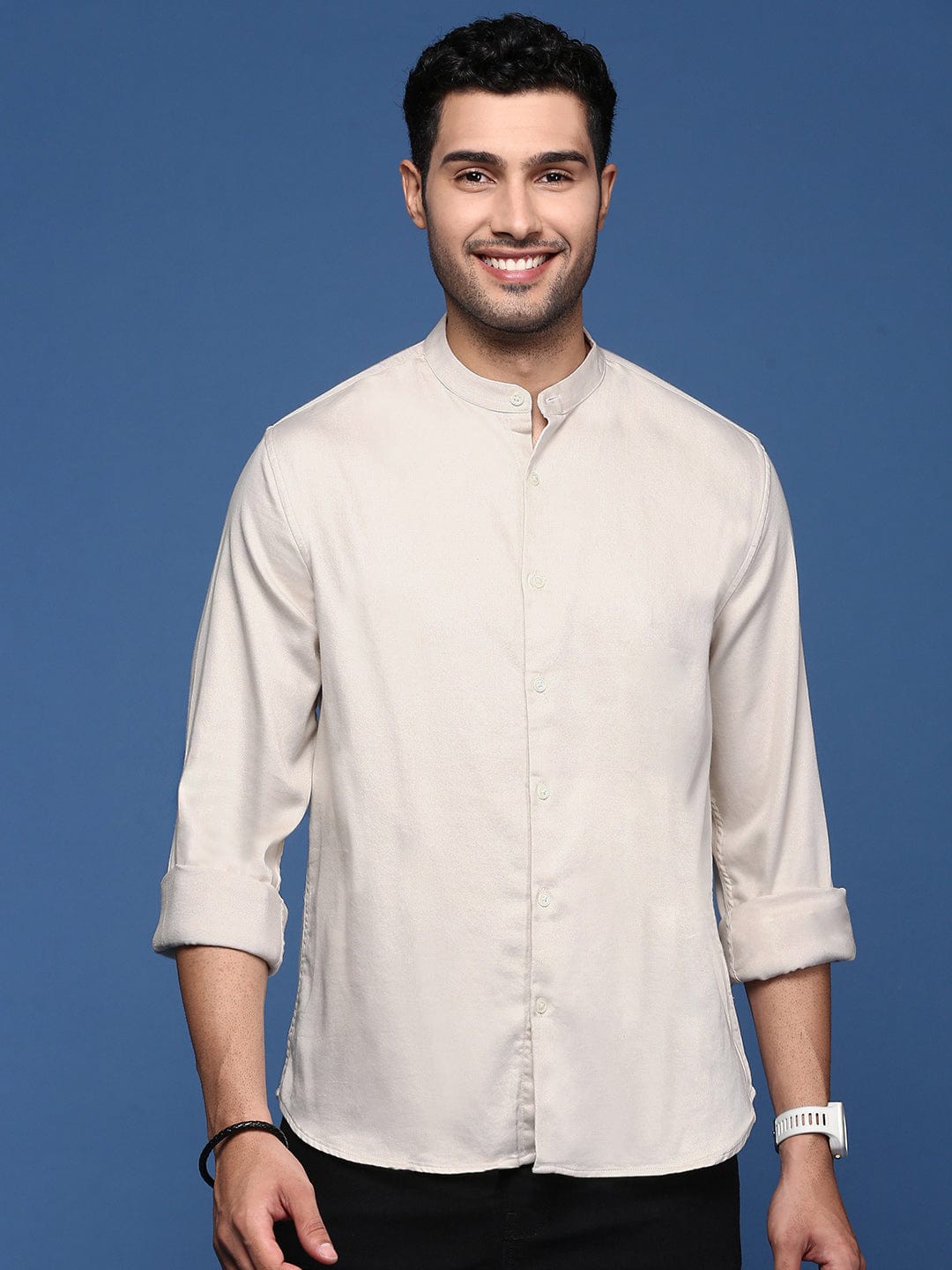 Men's Mandarin Collar Solid Beige Slim Fit Shirt