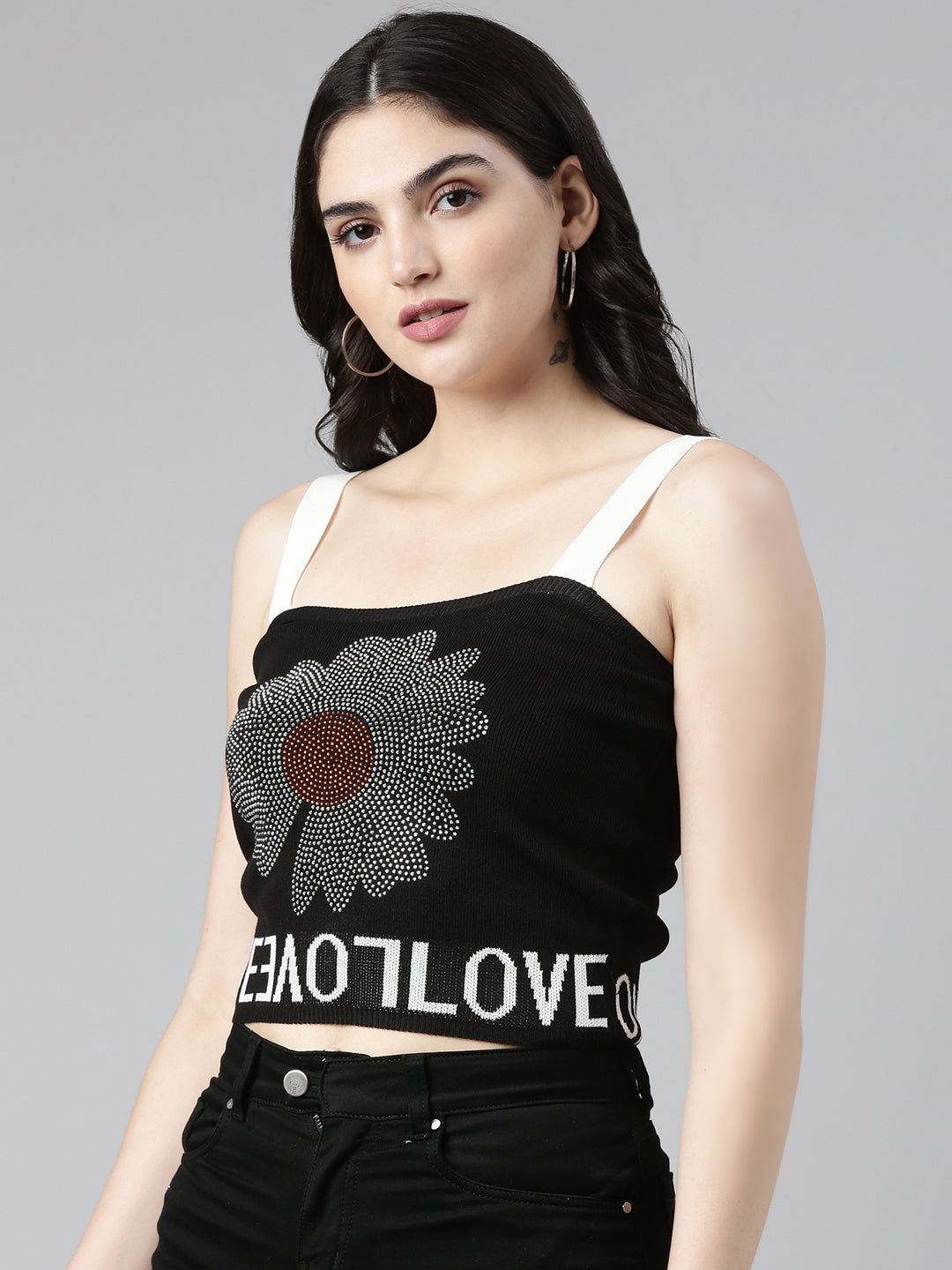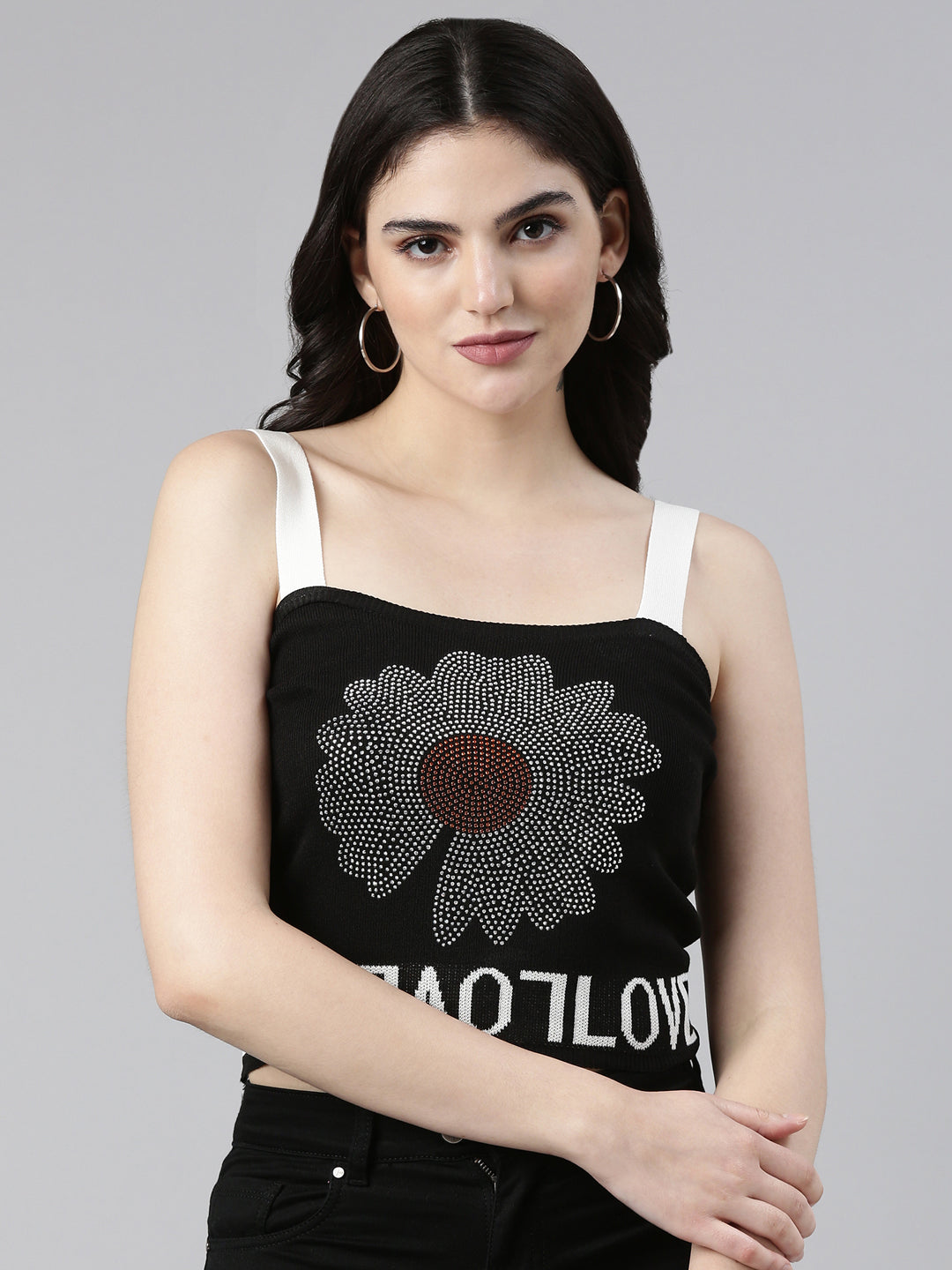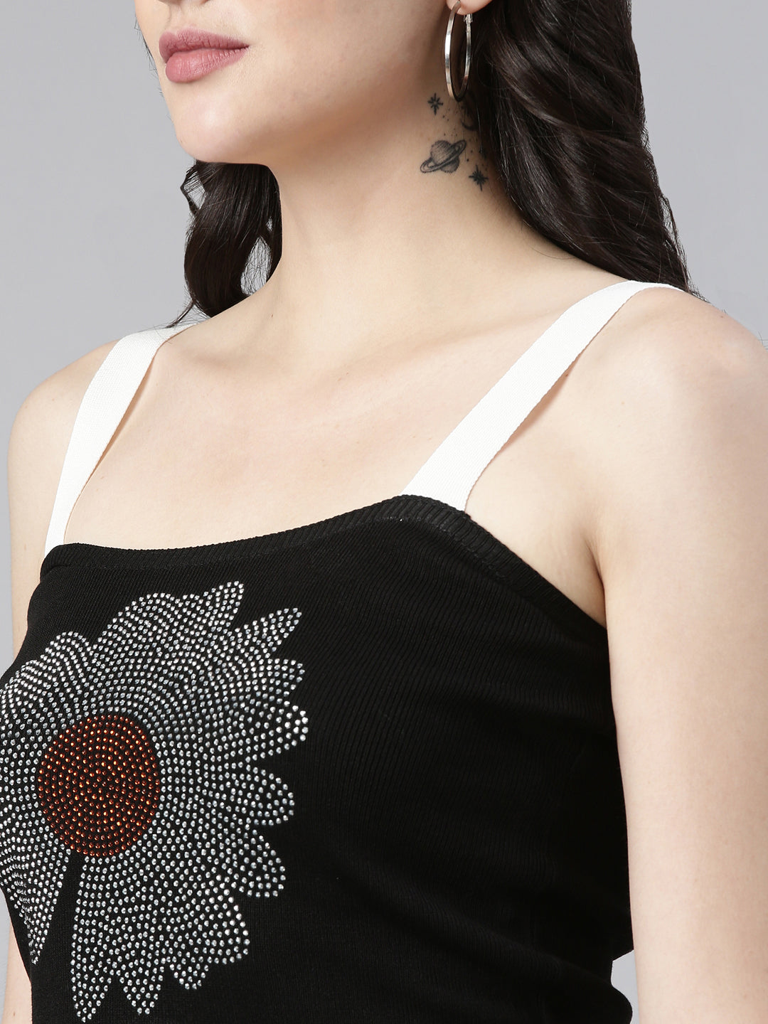 Women's Shoulder Straps Embellished Sleeveless Black Crop Tank Top
