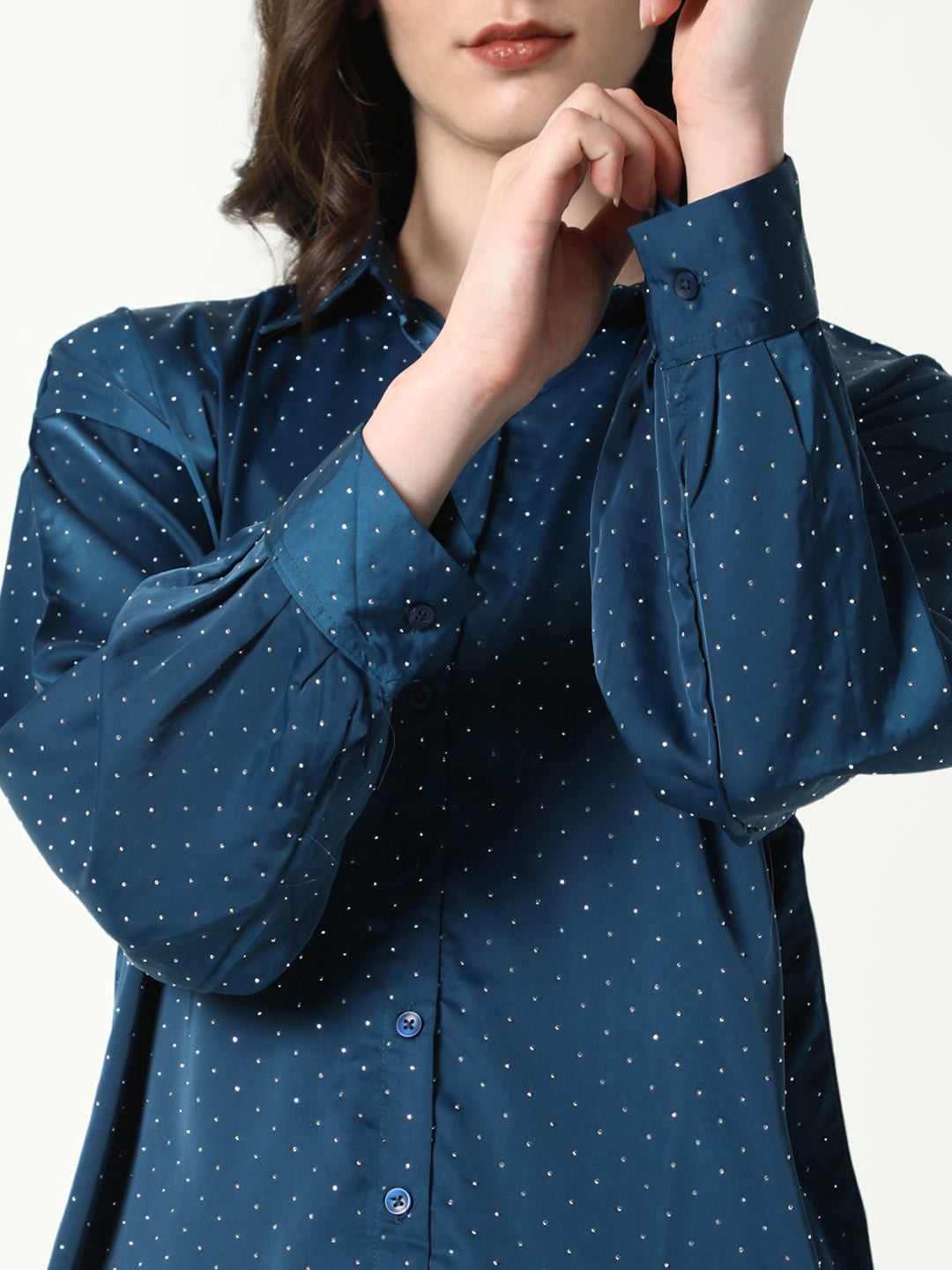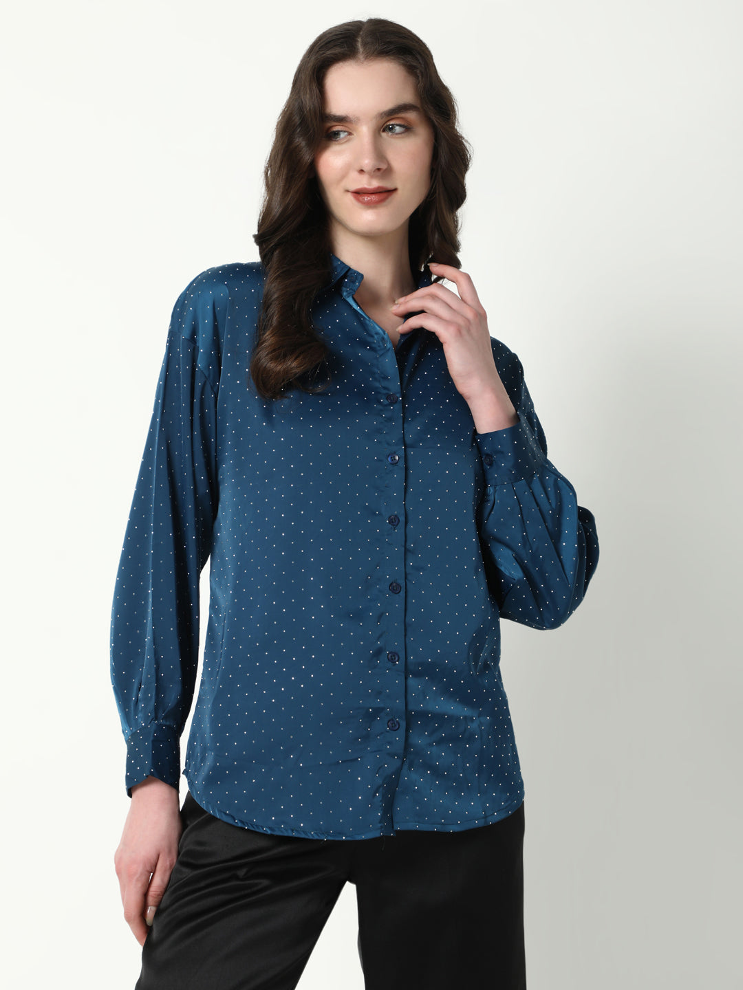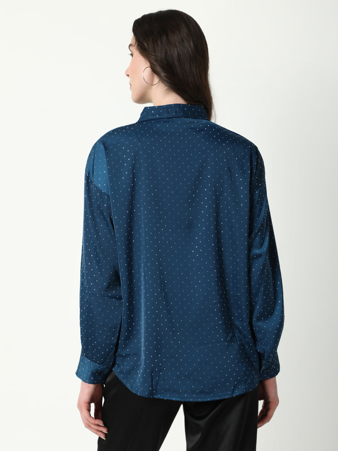 Women's Blue Comfort Spread Collar Micro Ditsy Printed Satin Relaxed Fit Casual Shirt