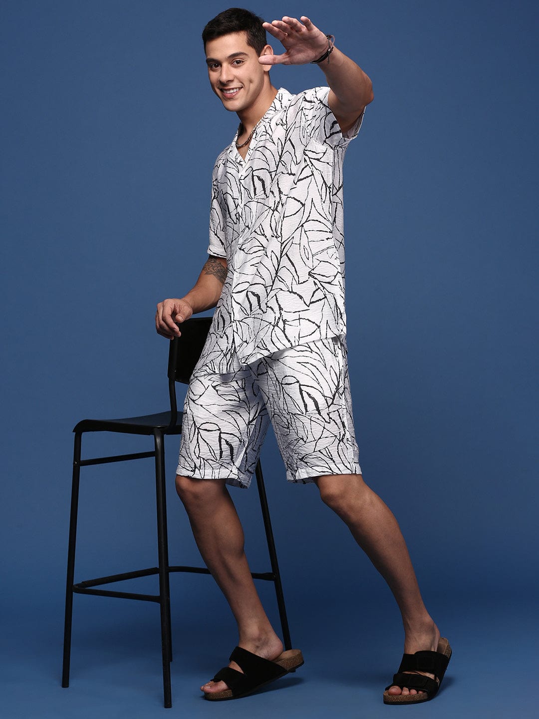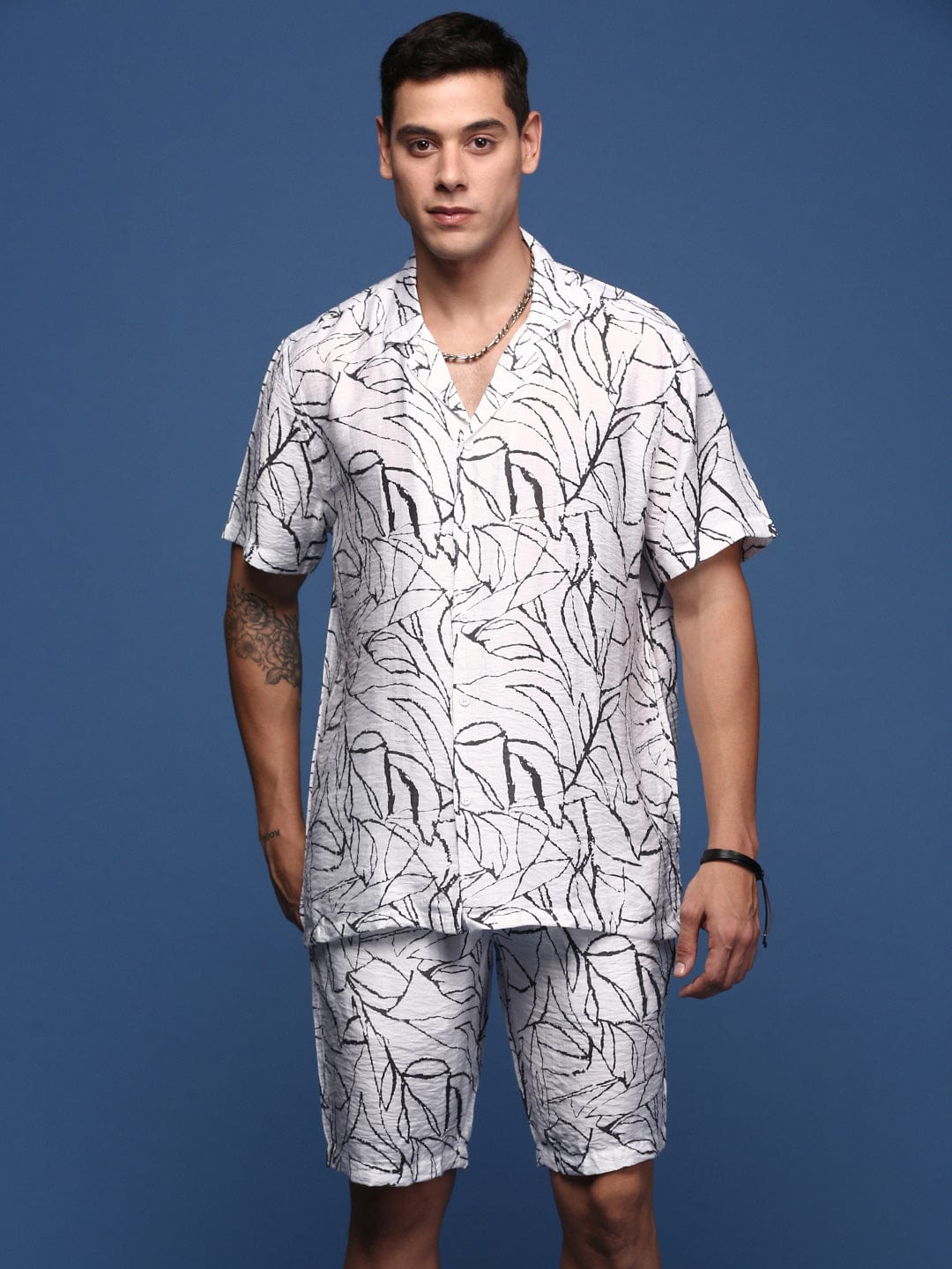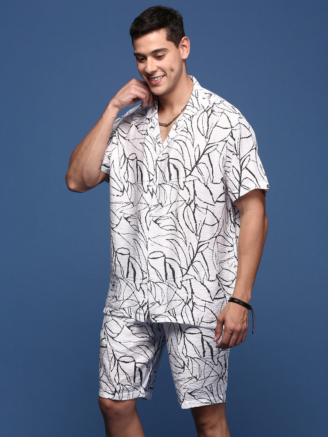Men's Cuban Collar Printed White Relaxed Fit Casual Co-Ords Set