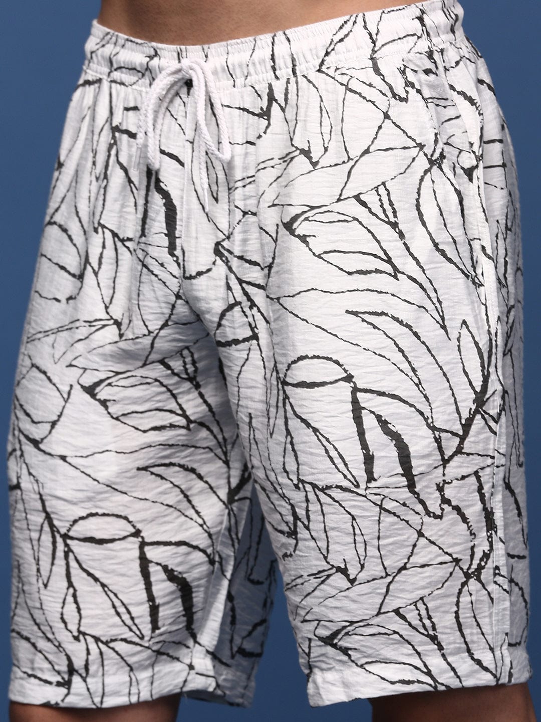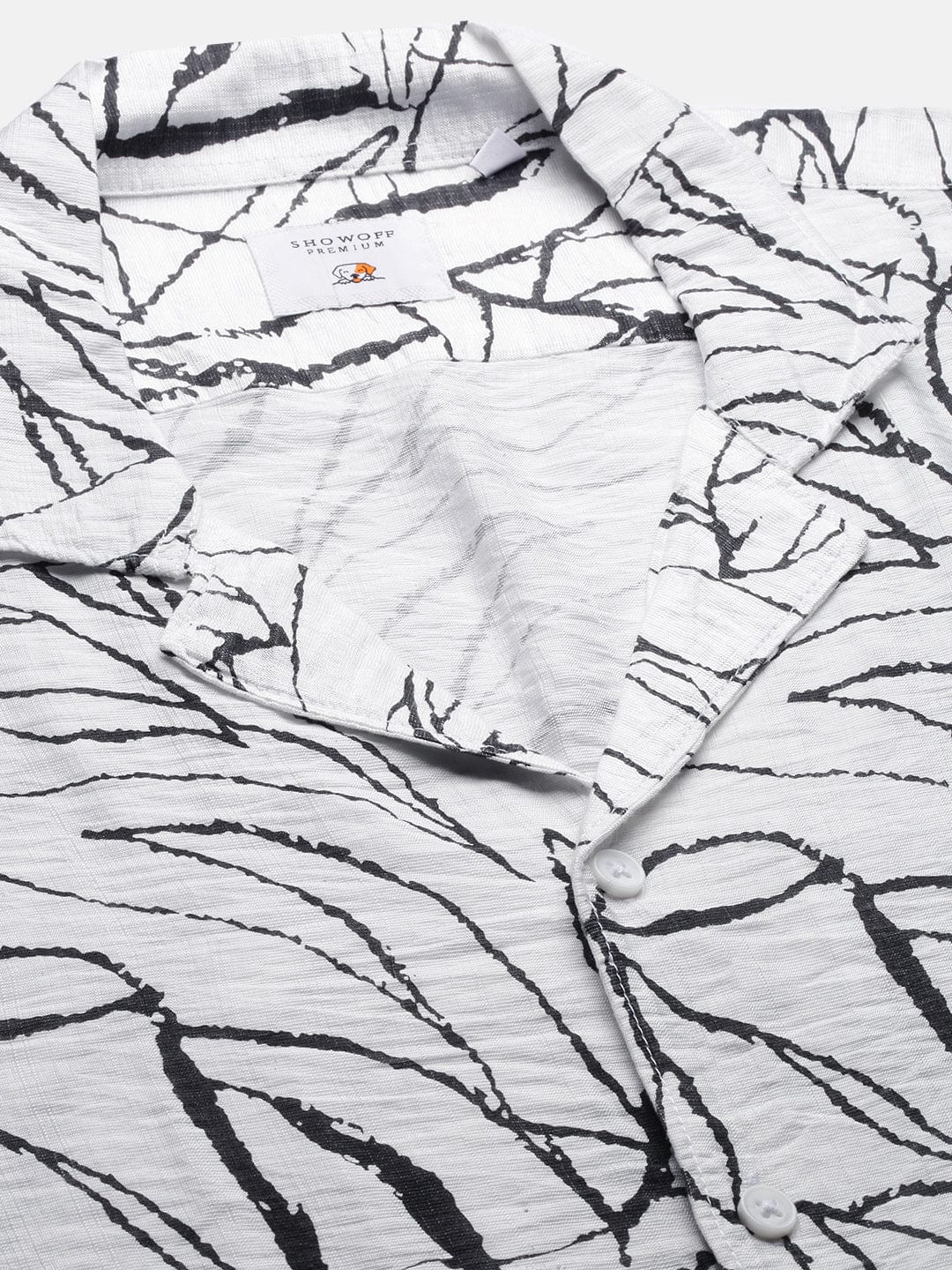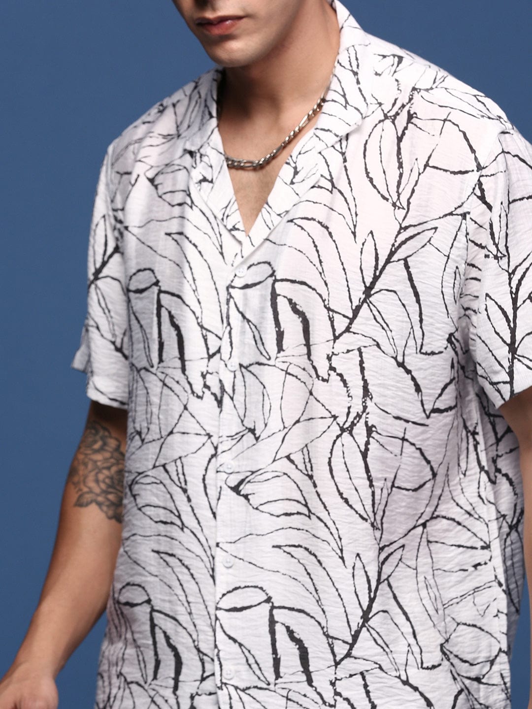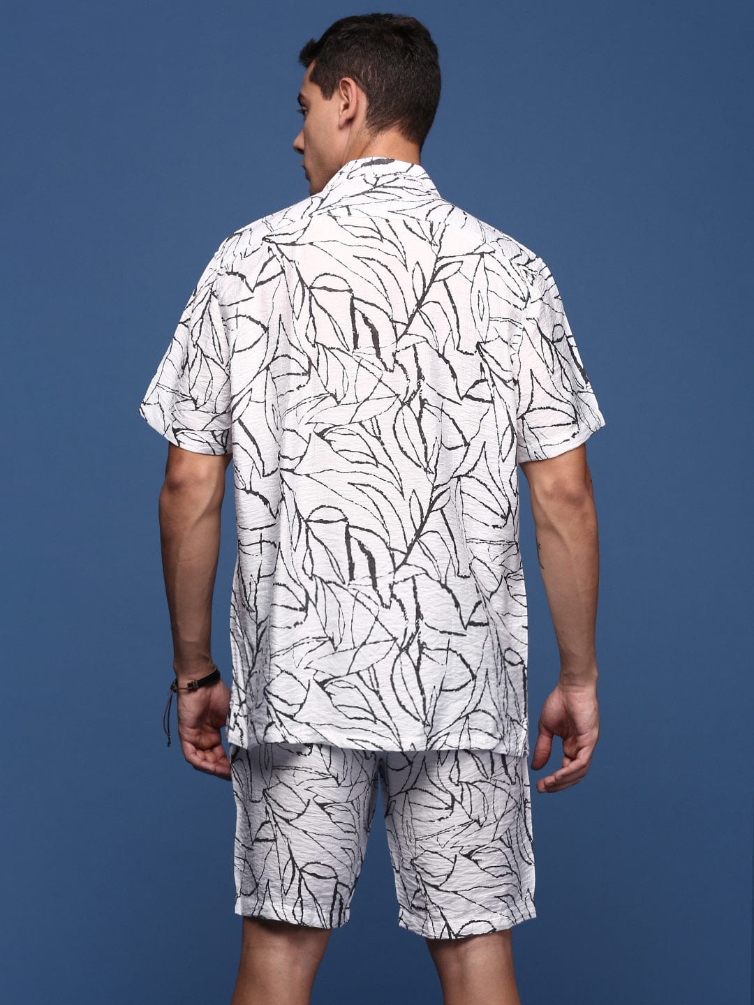 Men's Cuban Collar Printed White Relaxed Fit Casual Co-Ords Set